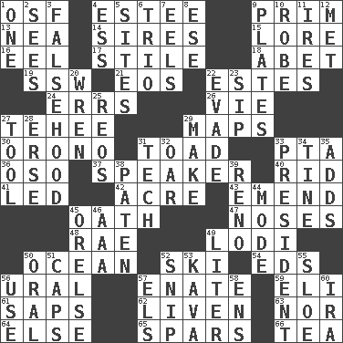 ACROSS 1. Order of Saint Francis (abbr.) 4. First name in cosmetics 9. Demure 13. Teachers' org. 14. Male parents of animals 15. Old wives' tales, e.g. 16. Snakelike fish 17. Vertical member of a panel or frame 18. Collude with 19. Compass dir. 21. Greek goddess of the dawn 22. _____ Park, CO 24. Blunders 26. Compete 27. Giggle 29. Atlas contents 30. U. of Maine site 31. Frog relative 33. Parent Teacher Association (abbr.) 36. Bear (Spanish) 37. Orator 40. To free from 41. Directed 42. 43,560 square feet 43. Make improvements or corrections to 45. Pledge 47. Olfactory organs 48. Actress Charlotte 49. Farming town in central California 50. Sea 52. What Jean-Claude Killy likes to do 54. Begley and Asner 56. Mountain range 57. Maternal 59. Biblical high priest 61. Plant excrements 62. Make or become more lively 63. And not 64. Otherwise 65. Practice fights 66. Beverage made from leaves DOWN 1. Single 2. Perceives with the eye 3. It jiggles the polygraph 4. Double-curved letter 5. Locates 6. Musical group of three 7. Snakelike fish 8. Compass dir. 9. Food holders 10. Loose flowing garment 11. Angers 12. Was introduced to 20. Songbird 22. Elude 23. Small drink 25. Vintage cars 27. Instrument 28. Celtic language 29. Cause to be 31. Georgia ____ (Atlanta school) 32. Rowing implement 33. Elected leader of a country 34. Prong on a fork 35. Does sums 38. Eucharist need 39. Western Nevada city 44. Method 45. Threatening words 46. Auto club (abbr.) 49. 61 cubic inches 50. Of the mouth 51. Balmoral and tarboosh 52. Clip 53. Polynesian shrub of the pepper family 55. A type of plum 56. Purpose 57. Raised railways 58. Followers of ems 60. Retirement account (abbr.)
