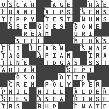 ACROSS 1. Witty Wilde 6. Grow older 9. Actress Charlotte 12. Movie unit 13. High mountains 14. Elected reps. 15. Likely to tip or tilt 16. Trial 17. Religious women 18. Compass dir. 19. Leaves 20. Went 21. 480, 500 or 516 sheets of paper 23. RI univ. 24. Stitch closed the eyes of (a falcon) 25. Catcalls? 28. Biblical high priest 30. Memorize 34. Fastener 35. Label 36. Bee-related 38. Lyricist Gershwin 39. Prong on a fork 41. Ancient Roman robes 43. Fast jet (abbr.) 44. Believer in; advocate of (suffix) 46. Back-to-school mo. 48. Bear (Spanish) 49. Von Bismarck 50. Ship's personnel 51. Much (prefix) 53. For each 56. Silvers or Donahue 57. Place where flour is made 58. Tree or shrub in the Birch family 60. Perceives with the eye 61. Toward the sea 62. Wash lightly 63. Big collection agency 64. 17th letter of the Greek alphabet 65. Related on the mother's side DOWN 1. Often (poetically) 2. Indian titles of respect 3. Smile enhancers 4. Electrical Unit 5. Marina Del _, California 6. Toward shelter 7. Global Positioning Systems (abbr.) 8. Eastern Standard Time (abbr.) 9. One who advocates reunion 10. Singer Murray 11. Double-curved letter 13. Tiny particle 14. Sounds asleep 19. An organ shaped like a helmet 20. Chewing product 22. Snakelike fish 24. Seigniories (variant) 26. Armed conflicts 27. Argument over a trivial matter 28. Singer James 29. Den 31. Fitting 32. River (Sp.) 33. Tired old horse 37. Offensive 40. Artist's stands 42. Put into a specified state 45. At this time 47. Cotton for raincoats, e.g. 49. Water jar 50. "Mermaids" star 51. Expression of disdain 52. Butter sub 54. Pulitzer Prize-winning author Ferber 55. Relief 56. Air pressure measure (abbr.) 57. Spoil 58. "We ___ not amused" (Victoria) 59. To separate or throw off