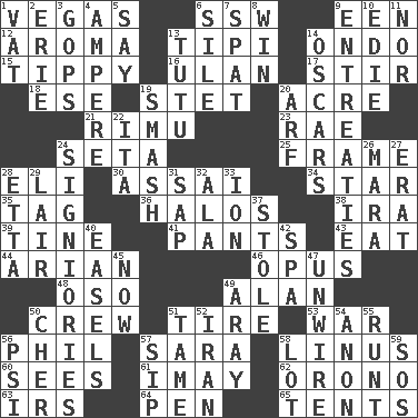 ACROSS 1. Viva Las _ 6. Compass dir. 9. Car or cant ending 12. Scent 13. Native american tent (variation) 14. Southwest Nigerian state 15. Likely to tip or tilt 16. ____ Bator, Mongolia 17. Disorderly outburst 18. Compass dir. 19. Proofreading order 20. Measure of real estate 21. Tall New Zealand timber tree 23. Actress Charlotte 24. Bristle 25. Movie unit 28. Connecticut Ivy Leaguer 30. Slender Brazilian palm 34. Play the lead 35. Label 36. Radiant circles of light 38. Lyricist Gershwin 39. Prong on a fork 41. Leg coverings 43. Erode 44. Believer in; advocate of (suffix) 46. Musical composition 48. Bear (Spanish) 49. ____ Jay Lerner 50. Group working together 51. Become fatigued 53. Armed conflict 56. Silvers or Donahue 57. "Two Mules for Sister ____" 58. "_ and Lucy" (Charlie Brown theme song) 60. Observes 61. "If ____ say so..." 62. U. of Maine site 63. Big collection agency 64. Fenced enclosure 65. Portable shelters DOWN 1. Large container 2. One of the Great Lakes 3. Republicans 4. Electrical Unit 5. Declare 6. Filth; sediment 7. Petty quarrel 8. Acquire through effort 9. Pleas 10. Singer Brickell 11. Not either 13. Ballerina skirt 14. Motion picture awards 19. Box-office sellout 20. Sandy's bark 22. Call ___ day 24. Seigniories (variant) 26. Hindu Mythology: god of death 27. Part of Q.E.F. 28. Singer James 29. Den 31. Plant excrement 32. Insect wing 33. Electrically charged atom 37. Took without asking 40. Artist's stands 42. Health resort 45. Immediately 47. Undo the wiring of 49. Like ___ of sunshine 50. "Mermaids" star 51. Not wild 52. SW Asia republic 54. Soon (poet.) 55. The smallest animal of a litter 56. Air pressure measure (abbr.) 57. Small drink 58. Car dealer's back yard 59. Distress signal