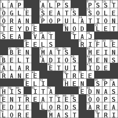 ACROSS 1. Infant locale 4. High mountains 8. Inconspicuous attention getter 12. Stare 14. Theater features 16. Not divided or shared with others 17. Northwest Algerian city 18. Census information 20. Miss Universe 1986, Barbara Palacios _ 22. Dreamland 23. Allow 24. Ocean 25. Large container 28. _ Mahal 30. Snakelike fish 31. Firearm 35. Benjamin's nick name 37. Floor protectors 40. Count _ (2 wds.) 41. Waist strap 42. Goodbye (Sp.) 44. Not women's 45. Having or resembling wings 46. Needle holder 47. Binary compound 48. The wife of a rajah (variant) 50. Woody plant 52. Connecticut Ivy Leaguer 54. Layer 55. Health resort 58. Part of HMS, perhaps 61. Call ___ day 63. Ferber et al. 65. Pleas 70. I made a mistake 71. Singer Brickell 72. Titled peers of a realm 73. Type of rug 74. Old wives' tales, e.g. 75. Vertical spar for supporting sails 76. Three (prefix) DOWN 1. Plunders 2. Match 3. Beach, in Buenos Aires 4. Viper 5. Lion 6. Infant food 7. Surprise greatly 8. Pacific Standard Time (abbr.) 9. The visible part of the earth's surface 10. A type of plum 11. Portable shelter 13. Conclude 15. Slit 19. The sixth month of the Jewish calendar 21. Night before a holiday 26. _ mater 27. Sadhe (variant) 29. Stevie Ray Vaughan's brother 30. Main course 32. Nourish 33. Actor's bit 34. Followers of ems 35. Actor Lugosi 36. Flair 38. Teat (slang) 39. _ pole 41. Oblong piece of solid material 43. Father 49. Writer Wiesel 51. Compass dir. 53. Slanted text style (abbr.) 55. Derisive sound 56. Some stationery 57. Slender Brazilian palm 58. The bottom of a shoe or boot 59. Southeast Asian peninsula 60. Commotion 62. Smallest unit of an element 64. ___ good deed 66. To riddle 67. Lyricist Gershwin 68. Begley and Asner 69. Fast jet (abbr.)