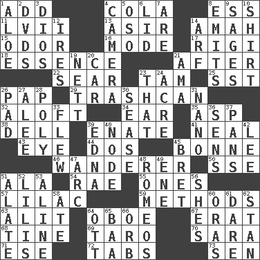 ACROSS 1. Say or write further 4. Root beer relative 8. Double-curved letter 11. 57 in ancient Rome 13. SW Saudi Arabia district 14. Wet nurse 15. Aroma 16. Method 17. Swiss mountan, "Queen of the Mountains" 18. Substance 21. Following 22. Burn superficially 23. Scottish cap 25. Fast jet (abbr.) 26. Infant food 29. File 13 32. At or to great height 34. Ewer handle 35. Viper 38. Small valley 39. Related on the mother's side 41. Actress Patricia 43. Sight organ 44. Two (Sp.) 45. Child's nurse 46. Roamer 50. Compass dir. 51. According to 54. Actress Charlotte 55. Washington bills 57. Pale purple color 59. Modes 63. Came down and settled, as after flight 64. Mitch Miller's instrument 67. Part of Q.E.F. 68. Prong on a fork 69. Pacific island yam 70. "Two Mules for Sister ____" 71. Compass dir. 72. Bar bills 73. Elected rep. DOWN 1. _ vera 2. Movie discs 3. "Vaya con ____" 4. Device for capturing images 5. Bear (Spanish) 6. Flaplike covering 7. "We ___ not amused" (Victoria) 8. Gives off 9. Gurus 10. Chest covering 12. Angers 14. Sandy's bark 19. Remaining after all deductions 20. 4-wheeled motor vehicle 21. Nursemaid (var.) 23. Not this but _ 24. Measure of real estate 26. Writing tablet 27. Toward shelter 28. More than one (prefix) 30. Gospel singer Marvin 31. Billionth: prefix 33. Soared 36. Elected reps. 37. Zero-star reviews 39. Pulitzer Prize-winning author Ferber 40. Thickened enlargement 42. Area sheltered from the wind 45. Cy Young winner Saberhagen 47. Curve 48. Lover boys 49. Compass dir. 51. Having winglike extensions 52. Ms. Damita and namesakes 53. Place in a line 56. "______ My Girl" (Turtles hit) 58. Had dinner 60. Mouths or openings 61. Have the gumption 62. Comedian Laurel of Laurel & Hardy 64. Baseball player Mel 65. Sound made by sheep 66. Globe