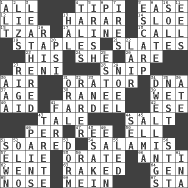 ACROSS 1. 100% 4. Native american tent (variation) 8. Relaxation 12. Whopper 13. Ethiopian city, capital of Harari 14. A type of plum 15. Russian ruler 17. Place in a line 18. Give a ring to 19. Paper fasteners 21. Chalkboards 23. Part of HMS, perhaps 24. A female animal or person 26. "We ___ not amused" (Victoria) 27. Painter Guido (1575-1642) 28. Sever or remove by pinching or nipping 30. Wind 31. Speaker 34. Heredity factor (abbr.) 37. Personal question 38. The wife of a rajah (variant) 39. Soggy 40. Assist 41. Bundle 42. Compass dir. 43. Lie 44. Table seasoning 46. For each 47. To sift 50. Pipe bend 51. Flew 54. Deli grouping 57. Writer Wiesel 58. Speak pompously 60. Opposed to 62. Gone 63. Swept the length of 64. Commissioned military rank (abbr.) 65. Characteristic smell of wine 66. Chow _ 67. R.R. building DOWN 1. Keyboard modifier key 2. Belonging to Elizabeth 3. Resembling or made to resemble leather 4. Stories 5. From or relating to Ireland 6. Baking dish 7. Angers 8. Fortification 9. Having winglike extensions 10. Not divided or shared with others 11. Snakelike fish 13. Actor Linden 16. Water falling in drops from the sky 20. 23rd letter of the Greek alphabet 22. Den 25. First name in cosmetics 27. Swiss mountan, "Queen of the Mountains" 29. Christmas carol 30. American Automobile Association (abbr.) 31. Of the mouth 32. More uncommon 33. Also 34. Residences 35. A home for chicks 36. Had dinner 41. Conductor's collection 43. Cylindrical with tapered ends 44. Ocean 45. _ mater 46. Aches 48. 1973 Nobel Price Winner (Physics) Leo 49. Consumed 51. Stitched 52. Butter sub 53. Dormintory (informal) 55. Directed 56. Proofreading order 59. Actress Charlotte 61. _ tizzy (2 wds.)