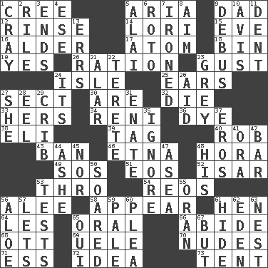 ACROSS 1. Algonquian 5. Roberta Peters solo 9. Male parent 12. Remove soap 14. Australian parrot (variant) 15. Night before a holiday 16. Tree or shrub in the Birch family 17. Smallest unit of an element 18. Storage container 19. Consenting reply 20. Food allowance for one day 23. Abrupt rush of wind 24. Small island 25. Hearing organs 27. Religious group 30. "We ___ not amused" (Victoria) 32. Expire 33. Possessive pronoun 34. Painter Guido (1575-1642) 36. Color 38. Connecticut Ivy Leaguer 39. Label 40. Director Reiner 43. Forbid 46. Inactive volcano in Sicily 48. Israeli folk dance 49. Mayday 51. Greek goddess of the dawn 52. Austrian river, tributary to the Danube 53. Through, poetically 54. Vintage cars 56. Toward shelter 58. Become visible 61. Layer 64. French article 65. Taken by mouth 66. Tolerate 68. Baseball player Mel 69. Ubangi River tributary 70. Unadorned figures 71. Curvy letter 72. The content of cognition 73. Portable shelter DOWN 1. Supercomputer manufacturer 2. Cause heat under the collar 3. Conclusions 4. Compass dir. 5. Mountain range southwest of Kyrgyzstan 6. Printing process, for short 7. Pressed 8. Direct toward a target or goal 9. To get out of a bus 10. Advice 11. Incision 13. Blunders 21. Having or resembling wings 22. Cigar-shaped 23. Jennifer or Joel 24. ___ a Wonderful Life 26. Help 27. A female animal or person 28. Snakelike fish 29. Baby bed with high sides 31. Related on the mother's side 35. Disregard 37. Greek god of love 41. Mouth or opening 42. Soap unit 44. American tennis player Robert 45. Not either 47. Toward the sea 48. Part of HMS, perhaps 50. Flew 53. Trials 55. Northwest Algerian city 56. Medicinal plant 57. Allows 59. Diluted with white 60. Entreaty 61. Flintstone garb 62. Locale of original sin 63. Egg locale 65. Fr. "Yes" 67. Yet