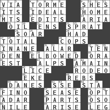 ACROSS 1. By way of 4. Singer Mel 9. "______ My Girl" (Turtles hit) 13. It is 14. Perfect 15. Residence 16. Mountains (abbr.) 17. Prepares for publication 18. Roberta Peters solo 19. Petroleum 21. Followers of ems 22. Small fatty European fish 24. Fly high 26. Possessed 27. Add up to 29. 911 reaches them 30. Empty; void 31. Having or resembling wings 33. Nine, plus one 36. Lair 37. Turned at an angle; bent 40. Mouth or opening 41. Eastern Standard Time (abbr.) 42. High mountains 43. With great haste 45. Louse (plural) 47. Cowboy competition 48. Supplement with great effort 49. Confederate soldiers (slang) 50. Natives or inhabitants of Denmark 52. Compass dir. 54. R.R. building 56. Fine (Spanish) 57. Gospel singer Marvin 59. Elect 61. The sixth month of the Jewish calendar 62. Actors' quests 63. Bear (Spanish) 64. Mediterranean tributary 65. Get up 66. Part of a journey DOWN 1. Zeal 2. "Tell ____ the Marines!" 3. Helper 4. Neckwear 5. More peculiar 6. It's straight from the horse's mouth 7. Floor protectors 8. Raised railways 9. Broken pieces 10. Israeli folk dance 11. Give off 12. Ocean 20. Grant temporary use of 22. Dinah or Pauly 23. Infant food 25. Toward shelter 27. Periodic rise and fall of the sea level 28. Washington bills 29. Crow sounds 31. Competent 32. Chop off 33. Inedible or poisonous agaric 34. One of the Great Lakes 35. Billionth: prefix 38. Shoestrings 39. Have the gumption 44. Disorderly crowds 45. Poe poem 46. Mamie's husband 49. Musical pauses 50. "You Light Up My Life" star Conn 51. Of or related to the anus 52. Scorch 53. Indian skirt 55. Domed church section 56. Air blower 57. Health resort 58. Compass dir. 60. Coat; cloak
