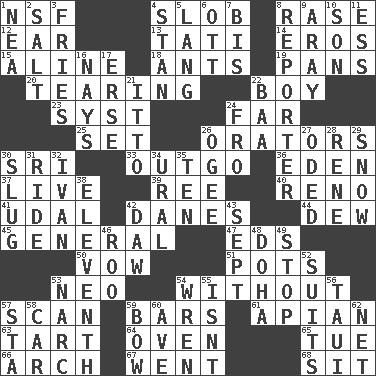 ACROSS 1. Science/research agcy. 4. Oscar Madison type 8. To erase 12. Hearing organ 13. Jacques of French films 14. Greek god of love 15. Place in a line 18. Pismires 19. Zero-star reviews 20. Pulling into pieces 22. Male child 23. System (abbr.) 24. At a great distance 25. Arrange properly for use 26. Speakers 30. Indian title of respect (Mr.) 33. Money paid out 36. Genesis locale 37. Not recorded 39. To sift 40. Western Nevada city 41. Freehold land 42. Natives or inhabitants of Denmark 44. Morning condensation 45. Commissioned military rank 47. Begley and Asner 50. Promise 51. Cooking vessels 53. Modern: prefix 54. Sans 57. Glance over 59. Drinking establishments 61. Bee-related 63. Small pie 64. Baking chamber 65. Third day of the wk. 66. Bowlike part 67. Gone 68. Be seated DOWN 1. Teachers' org. 2. Table seasoning 3. Strips of potato fried in deep fat 4. Comedian Laurel of Laurel & Hardy 5. Long (Scottish) 6. Baseball player Mel 7. Twice 8. Newsperson 9. Like ___ of sunshine 10. Male offspring 11. Double-curved letter 16. Negative votes 17. Celtic language 21. "Tell ____ the Marines!" 22. Sound made by sheep 24. From 26. Double curve, resembling the letter S 27. Wrote a lyric poem 28. French philosopher Descartes 29. Frozen precipitation 30. Snaillike creature with no shell 31. Travel on an animal 32. _ the terrible 34. Mountain range 35. Nine, plus one 38. Veterans Day date 42. Fool 43. Back-to-school mo. 46. Friend of Pooh 48. Capital of the state of Qatar 49. Constrict 52. Sets or collections 53. Drug cop 54. Songbird 55. Is not 56. "Change" in Tahitian 57. R.R. building 58. 4-wheeled motor vehicle 59. Ribbon knot 60. "___ Maria" 62. Fish or hair follower