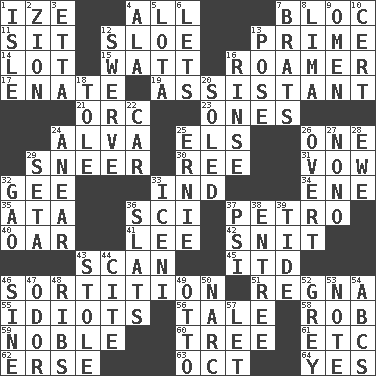 ACROSS 1. Ending with capital 4. Everything 7. Coalition 11. Be seated 12. _ gin 13. A-one 14. Car dealer's back yard 15. Electrical Unit 16. Nomad 17. Maternal 19. Aide 21. The grampus (Milton) 23. Singles 24. Inventor's middle name 25. Raised railways 26. Single 29. Scornful expression 30. To separate or throw off 31. Solemn pledge 32. Turn to the right 33. Indiana (abbr.) 34. Compass dir. 35. "One Day ___ Time" 36. _-fi 37. Stone: prefix 40. Boat paddle 41. Area sheltered from the wind 42. In a ____ (agitated or irritated) 43. Examine hastily 45. It would 46. Decision 51. Rain (Swedish) 55. Foolish or stupid persons 56. Lie 58. Director Reiner 59. Having high moral qualities 60. Family _ (genealogy) 61. And so on (abbr.) 62. Celtic language 63. Sep. follower 64. Consenting reply DOWN 1. Capri or Wright 2. The Jewish people; Israel 3. Singer James 4. In the manner of 5. Globular water bottle used in Asia 6. Allows 7. Naughty children 8. Pale green bean 9. Sign of something about to happen 10. An absolute certainty 12. Turn aside suddenly 13. Introduce or present, as a question 16. Wash lightly 18. Lacquered or enameled metalware 20. Having a sole or soles 22. Automobile 24. Approach 25. Bert's buddy 26. Unconcealed 27. Words to Nanette 28. She-sheep 29. Bristle 32. E Mali city 33. Ancient Celtic tribe of eastern Britain 36. Narrow boards 37. Air pressure measure (abbr.) 38. Main course 39. Event that recurs at intervals 43. Fur scarf 44. Quote 46. Trig term 47. Aroma 48. Teases 49. "Beetle Bailey" pooch 50. Drug cop 52. Jennifer or Joel 53. Short letter 54. Lettered men learn these first 57. Allow