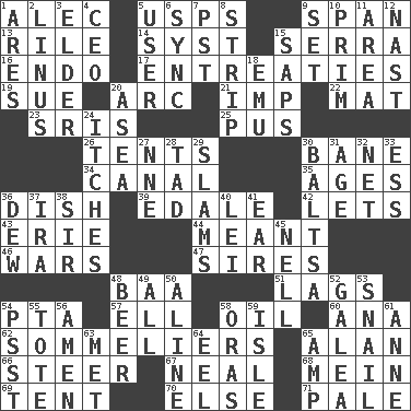 ACROSS 1. Actor Baldwin 5. United States Postal Service (abbr.) 9. Connect, as a bridge 13. Cause heat under the collar 14. System (abbr.) 15. Father Junipero _ 16. Inside; within (prefix) 17. Pleas 19. Take to court 20. Curve 21. Naughty child 22. Floor covering 23. Indian titles of respect 25. Purulenc 26. Portable shelters 30. Object of repulsion 34. Lessep's creation 35. Ripens 36. Food container 39. Peak District village in England 42. Allows 43. 4th largest of the Great Lakes 44. Intended 46. Armed conflicts 47. Male parents of animals 48. Sound made by sheep 51. Falls behind 54. Parent Teacher Assoc. 57. Pipe bend 58. Petroleum 60. Santa ___, CA 62. Wine waiters 65. Actor Alda or Thicke 66. Navigate 67. Anneal 68. Chow _ 69. Portable shelter 70. Otherwise 71. Light colored DOWN 1. Ancient Greek god of war 2. "_ and Lucy" (Charlie Brown theme song) 3. A person who is older than you are 4. Corporate head (abbr.) 5. One who uses or employs something 6. Synchronize (abbr.) 7. Pacific Standard Time (abbr.) 8. Remove all contents or possession from 9. Put into a specified state 10. Demure 11. Length times width 12. Political cartoonist Thomas 15. Plant excrements 18. Australian flightless bird 20. Toward the sea 24. Irritating cutaneous sensations 27. Compass dir. 28. Bit 29. Hits or strikes with great force 30. Greek mezzo-soprano Agnes 31. Personal question 32. Fish or hair follower 33. Curvy letter 36. Morning condensation 37. Retirement account (abbr.) 38. Title for a knight 40. Luau accessory 41. Hearing organ 45. 1994 drama film starring Jodie Foster 48. Fermented drink made from hops 49. Everything 50. Place in a line 52. An organ shaped like a helmet 53. Slow-paced one 54. Inconspicuous attention getter 55. Carry 56. So be it 58. Mouths or openings 59. Small island 61. Singer Murray 63. Was introduced to 64. Snakelike fish 65. Electrical Unit
