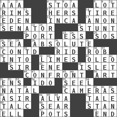 ACROSS 1. Auto club (abbr.) 4. Portico 8. Car dealer's back yard 11. Basketball hoops 13. Possessive pronoun 14. Hoop that covers a wheel 15. Genesis locale 16. South American Indian 17. At once, immediately (arch.) 18. Elected representative 21. Difficult or unusual or dangerous feat 22. Left side of a ship or aircraft 23. Curvy letter 25. Mayday 26. Ocean 29. Utter; complete 32. Continued (abbr.) 34. To free from 35. Director Reiner 38. To the inside or interior of 39. Citrus fruits 41. Margarine 43. Title for a knight 44. Compass dir. 45. Small island 46. Meet 50. Tate display 51. Followers of ems 54. Wedding promise 55. Stitch closed the eyes of (a falcon) 57. Brizilian seaport 59. Devices for capturing images 63. SW Saudi Arabia district 64. Inventor's middle name 67. Lie 68. Baby powder 69. Shrivel 70. Comedian Laurel of Laurel & Hardy 71. Pipe bend 72. Plant holders 73. Conclusion DOWN 1. Ancient Greek god of war 2. Helper 3. So be it 4. Upper-body garments 5. Nine, plus one 6. The grampus (Milton) 7. White ___ sheet 8. "_ and Lucy" (Charlie Brown theme song) 9. U. of Maine site 10. Portable shelters 12. Fastener 14. Make lace 19. Frog relative 20. Globe 21. Fast jet (abbr.) 23. Writer Wiesel 24. Soap bubbles 26. _-fi 27. Immeasurably long periods of time 28. Against 30. Abalone 31. Greek god of love 33. Torque (variant) 36. Water jar 37. Fermented drink made from hops 39. Grant temporary use of 40. A message received and understood 42. Baseball player Mel 45. A distinct part 47. Lubricate 48. Motion picture awards 49. Teachers' org. 51. Maternal 52. Rhinal 53. Free from disturbance or agitation 56. Allows 58. Curve 60. Assign a rank or rating to 61. Actor Alda or Thicke 62. Post 64. Viper 65. Lion 66. Large container