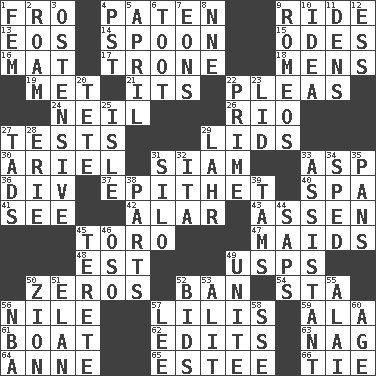 ACROSS 1. From 4. Eucharist need 9. Travel on an animal 13. Greek goddess of the dawn 14. Soup utensil 15. Lyric poems 16. Floor covering 17. Heavy duty weighing machine 18. Not women's 19. Was introduced to 21. ___ a Wonderful Life 22. Entreaties 24. Famous astronaut Armstrong 26. _ de Janeiro 27. Trials 29. Flaplike coverings 30. Satellite of Uranus 31. Thailand, formerly 33. Cleo's killer 36. HTML Container Element 37. Curse 40. Health resort 41. Observe 42. Having or resembling wings 43. NE Netherlands city 45. "Corrida" creature 47. Women servants 48. Eastern Standard Time (abbr.) 49. United States Postal Service (abbr.) 50. Nothings 52. Prohibit 54. R.R. building 56. The longest river in the world 57. Ms. Damita and namesakes 59. Insect wing 61. Water vessel 62. Prepares for publication 63. Tired old horse 64. Queen of England 1702-14 65. First name in cosmetics 66. Neckwear DOWN 1. Opposite of masc. 2. Wander 3. Clearly or manifestly demonstrative 4. Pacific Standard Time (abbr.) 5. Showery time 6. A blast of a horn 7. Immeasurably long periods of time 8. Compass dir. 9. Lover boys 10. The content of cognition 11. Lairs 12. Double-curved letter 20. Wig 22. First class 23. Flaplike covering 25. Small island 27. Small amounts or degrees 28. 4th largest of the Great Lakes 29. Cowardly lion portrayer 31. Grain storage tower 32. Call ___ day 33. Aide 34. Broke a traffic law 35. Zero-star reviews 38. Pieces 39. Scottish caps 44. Plant excrements 45. Cigar-shaped 46. Bear (Spanish) 49. Join together 50. The Jewish people; Israel 51. Liveliness 52. Auction offers 53. Came down and settled, as after flight 55. Mountain range southwest of Kyrgyzstan 56. Basketball assoc. 57. Area sheltered from the wind 58. Compass dir. 60. Ripen