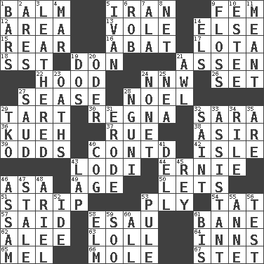 ACROSS 1. Lip ointment 5. SW Asia republic 9. Opposite of masc. 12. Type of rug 13. Short-tailed, large-bodied rat 14. Otherwise 15. Rump 16. Blind as ____ 17. Globular water bottle used in Asia 18. Fast jet (abbr.) 19. Spanish title 21. NE Netherlands city 22. Parka part 24. Compass dir. 26. Arrange properly for use 27. Gospel singer Marvin 28. Christmas carol 29. Small pie 30. Canadian anthropologist Darnell 32. "Two Mules for Sister ____" 36. Malaysian steamed pastry 37. Sorrow 38. SW Saudi Arabia district 39. Likelihood 40. Continued (abbr.) 42. Capri or Wright 43. Farming town in central California 44. Bert's buddy 46. White ___ sheet 49. Mature 50. Allows 51. Remove all contents or possession from 53. Travel a route regularly 54. Make lace 57. Expressed in words 58. Son of Isaac 61. Object of repulsion 62. Toward shelter 63. Hang loosely or laxly 64. Restaurants 65. Cartoonist voice _ Blanc 66. Undercover agent 67. Proofreading order DOWN 1. Soap units 2. Ancient Greek god of war 3. Tough but pliablecoriaceous 4. Spoil 5. _ the terrible 6. Director Reiner 7. According to 8. Fish or hair follower 9. Soft thread for cleaning between teeth 10. First name in cosmetics 11. Intended 14. Raised railways 19. Two (Sp.) 20. River in Europe 21. Leather borer 23. Profane or obscene expressions 24. Music written for nine 25. Teachers' org. 27. Saudi Arabian king (1953-1964) 28. Group of southern Bantu languages 29. Ring climax 31. Wear away 32. Virtuous person 33. Aide 34. Cause heat under the collar 35. "We ___ not amused" (Victoria) 40. Gear tooth 41. Small valley 43. Pet locale 45. Marina Del _, California 46. Indian state 47. Lacking originality or spontaneity 48. Satellite of Uranus 52. Binary compound 53. Whine 55. Queen of England 1702-14 56. Trial 58. Shade tree 59. "Barney Miller" actor Jack 60. 100% 61. Altar cloth linen