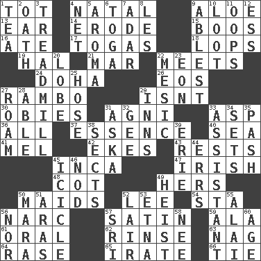 ACROSS 1. Small child 4. Relating to or accompanying birth 9. Medicinal plant 13. Hearing organ 14. Eat (away) 15. Expressions of contempt or scorn 16. Had dinner 17. Ancient Roman robes 18. Chops off 19. Actor Linden 21. Impair 22. Confronts 24. Capital of the state of Qatar 26. Greek goddess of the dawn 27. Role for Stallone 29. Is not 30. Off-Broadway awards 31. Hindu god of fire 33. Viper 36. 100% 37. Gist 40. Ocean 41. Cartoonist voice _ Blanc 42. Supplements with great effort 43. Musical pauses 45. South American Indian 47. From or relating to Ireland 48. Small bed 49. Possessive pronoun 50. Women servants 52. Area sheltered from the wind 54. R.R. building 56. Drug cop 57. Smooth fabric 59. According to 61. Relating to the mouth 62. Wash lightly 63. Tired old horse 64. To erase 65. Feeling or showing extreme anger 66. Neckwear DOWN 1. Beverage made from leaves 2. Pledge 3. Excercise machine 4. Fish or hair follower 5. Scent 6. Ancient Roman robe 7. The sixth month of the Jewish calendar 8. French article 9. Most capable 10. Spoils 11. I made a mistake 12. Curvy letter 20. Ear part 22. Of or pertaining to a meson 23. A really long time 25. Flexible conduit 27. Wander 28. Competent 29. Lodging establishments 31. "____ silly question..." 32. Turn to the right 33. Aide 34. Puts into a specified state 35. Romantic infatuation 38. Religious groups 39. One of the Great Lakes 44. Blunders 45. Ice on the eave 46. Dreamland 49. Robbery 50. Hindu Mythology: god of death 51. Ancient river in northeast Turkey 52. Den 53. Inactive volcano in Sicily 55. Jai _ 56. And not 57. Indian title of respect (Mr.) 58. Born 60. Personal question