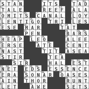 ACROSS 1. Comedian Laurel of Laurel & Hardy 5. ___ a Wonderful Life 8. Small amount or degree 11. Falsehood 12. Coral ridge 14. Insect wing 15. Leaves out 17. Lessep's creation 18. Myrna of the movies 19. Small, flat, pigmented spot on the skin 21. Three (prefix) 22. French article 23. Compass dir. 24. Third mo. 25. Make lace 27. Animal enclosure 28. Taverns 31. Pile 35. Lion 37. Toward shelter 38. Celtic language 39. Had dinner 41. Penny 42. Political cartoonist Thomas 43. Teat (slang) 45. At sea 46. Disorderly outburst 47. Afternoon social gathering 49. Title for a knight 51. Actor Linden 52. Eastern Standard Time (abbr.) 55. Fish or hair follower 57. Begley and Asner 60. Center 62. Epoch 63. Underwater navigation system 65. Fertile tracts in a desert 66. The 18th letter of the Arabic alphabet 67. Son of Odin 68. The smallest animal of a litter 69. Allow 70. Deep reverence 71. Puts into a specified state DOWN 1. Fur scarf 2. Makes less strong or intense 3. Place in a line 4. Remaining after all deductions 5. Lyricist Gershwin 6. Portable shelter 7. Wither 8. Baron Munchausen's specialties 9. _ vera 10. 24-hour periods 13. Secret move to avoid paying debts 16. Simple or foolish person 17. Pupil covering 20. Highlander 26. Phillipine bananalike plant 29. French philosopher Descartes 30. Bristle 31. Coop moms 32. Part of Q.E.F. 33. Aide 34. _ dish (used to culture cells) 36. Baseball player Mel 40. One or the other 44. Beverages made from leaves 48. In addition 50. Respite 52. Follow as a consequence or result 53. Aroma 54. Trials 55. Anneal 56. 4th largest of the Great Lakes 58. Capital of the state of Qatar 59. Overwhelm 61. Hearing organs 64. "We ___ not amused" (Victoria)