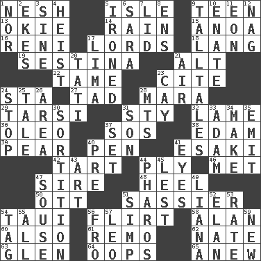 ACROSS 1. Delicate 5. Capri or Wright 9. Adolescent 13. Migrant worker of the '30s 14. Precipitation 15. Small Philippine buffalo 16. Painter Guido (1575-1642) 17. Titled peers of a realm 18. Austrian-born American filmmaker Fritz 19. French poetic form 21. Keyboard modifier key 22. Docile 23. Quote 24. R.R. building 27. Small amount or degree 28. Hindu Mythology: god of death 29. Tarsus (plural) 31. Filthy place 32. Unable to walk 36. Margarine 37. Distress signal 38. Dutch treat 39. Lightbulb-shaped fruit 40. Animal enclosure 41. 1973 Nobel Price Winner (Physics) Leo 42. Small pie 44. Strand of rope, yarn or thread 46. Was introduced to 47. Beget 48. Person who is morally reprehensible 50. Baseball player Mel 51. More impudent 54. "Change" in Tahitian 56. Talk or behave amorously 58. Actor Alda or Thicke 60. In addition 61. San ____ (Riviera town) 62. Nathan's nickname 63. Small, secluded valley 64. I made a mistake 65. Afresh DOWN 1. Not either 2. Makes supply last 3. Trig term 4. Robbery 5. Pressed 6. "Two Mules for Sister ____" 7. Flaplike covering 8. Followers of ems 9. Baron Munchausen's specialties 10. Maternal 11. Age 12. Tired old horse 17. Pale green bean 20. Jacques of French films 21. Wind 23. Island 24. Cease 25. Story 26. Length times width 28. Mountains (abbr.) 30. Conclusion 31. Male child 33. First man 34. Cause to be 35. Give off 37. Arrange properly for use 40. Before (prefix) 41. Snake ____ (dice throw) 43. Nonscientific branch of learning 44. N Egypt peninsula 45. For fear that 47. Boozer 49. Woody, climbing, usually tropical plant 51. Simple or foolish person 52. Enthusiasm 53. Pace 54. Label 55. 100% 56. Away 57. Lion 59. ___ Haven, CT