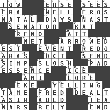 ACROSS 1. Pull behind 4. Celtic language 8. Observes 12. Epoch 13. 1994 drama film starring Jodie Foster 14. Greek god of love 15. Relating to or accompanying birth 18. 24-hour periods 19. Political cartoonist Thomas 20. Elected representative 22. Krazy ___ of comics 23. San ____ (Riviera town) 24. Small island 25. Dripping 26. Moved like an arrow 30. Eastern Standard Time (abbr.) 33. Happening 36. Make new 37. Caspian sea tributary 39. Sep. follower 40. Transmit 41. Simple or foolish person 42. Agitate, as a liquid 44. Writing tablet 45. Center 47. Frozen water 50. Cuckoo 51. Old wives' tales, e.g. 53. Supplement with great effort 54. Crying or shouting loudly 57. Docile 59. Flintstone 61. Started a card game 63. SW Saudi Arabia district 64. Old (Scot.) 65. Afternoon social gathering 66. Armed conflicts 67. Have trust in 68. Conclusion DOWN 1. "___ Little Indians" 2. Mouths or openings 3. Wetness 4. Inside; within (prefix) 5. Buttocks 6. Roguish 7. Raised railways 8. Elected representatives 9. Part of Q.E.F. 10. Greek goddess of the dawn 11. Fast jet (abbr.) 16. Afresh 17. Unable to walk 21. Carryall 22. Apertif with cassis 24. Nonscientific branch of learning 26. Pismires 27. Shed a tear 28. Pulitzer Prize-winning author Ferber 29. Texas town _ City 30. Relaxation 31. Indian titles of respect 32. Scottish caps 34. Grand slam 35. Environmental prefix 38. Orators 42. _-fi 43. Land elevation 46. Compass dir. 48. Lacking warmth 49. One of the Great Lakes 52. Maternal 53. Independent ruler or chieftain 54. Shout 55. Whirlpool 56. Small, secluded valley 57. The 23rd letter of the Hebrew alphabet 58. White ___ sheet 59. At a great distance 60. Regret 62. Small amount or degree