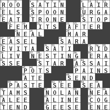 ACROSS 1. Friend of Pooh 4. Smooth fabric 9. Den 13. Raised railways 14. Soup utensil 15. Capital and largest city of Mongolia 16. Erode 17. Heavy duty weighing machine 18. Close up, plug up 19. Opposite of masc. 21. It is 22. Following 24. Be tempered by heat 26. Spoil 27. Artist's stand 29. "Two Mules for Sister ____" 30. Webber/Rice musical 31. Suttee (variant) 33. To free from 36. 54 in ancient Rome 37. Snuggling 40. Epoch 41. Compass dir. 42. Play the lead 43. Slender Brazilian palm 45. Cooking vessels 47. Aches 48. Had dinner 49. Transmit 50. Thick mixture 52. Perceive with the eye 54. Ocean 56. Scottish caps 57. Pitcher Ryan 59. Teachers' org. 61. Toward shelter 62. Place in a line 63. Gear tooth 64. Watch over 65. Honkers 66. Compass dir. DOWN 1. Portuguese money of account (variant) 2. Norwegian king 3. Clearly or manifestly demonstrative 4. Fast jet (abbr.) 5. Showery time 6. A blast of a horn 7. Charged particles 8. Compass dir. 9. A period of five years 10. Johnson of "Laugh-In" 11. Russian composer Stravinsky 12. Strike 20. Confront 22. With great haste 23. At a great distance 25. Actor Alda or Thicke 27. Snakelike fish 28. Deliberation 29. Commotion 31. Fast planes 32. _ moment's notice (2 wds.) 33. Dwelling 34. SW Asia republic 35. Raised platform 38. First name in cosmetics 39. Stare wonderingly 44. Without 45. Went by 46. Baseball player Mel 49. Seines 50. Light colored 51. So be it 52. Not divided or shared with others 53. Writer Wiesel 55. Period of immesurable duration 56. Make lace 57. Tired old horse 58. Born 60. Personal question