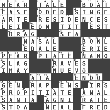 ACROSS 1. Put on (as clothing) 5. Falsehood 9. Water vessel 13. Comfort 14. Wrote a lyric poem 15. Burn superficially 16. Johnson of "Laugh-In" 17. Dwellings 19. Luau accessory 20. Age 21. Teat (slang) 22. Eastern Standard Time (abbr.) 23. To trail on the ground 25. Ocean 26. Relating to the nose 30. Soup holder 34. Peak District village in England 35. One of the Great Lakes 36. Lightbulb-shaped fruit 39. Food holder 42. Billionth: prefix 43. Volcanic refuse 44. All-night dance parties 46. "If ____ say so..." 47. New (sp.) 48. _ moment's notice (2 wds.) 51. Inside; within (prefix) 54. Commissioned mil. rank 57. Hit sharply and swiftly 58. Followers of ems 60. Big collection agency 62. Appease 65. Of or related to the anus 66. Before Barbara or Clara 67. Hindu god of fire 68. Assign a rank or rating to 69. Portico 70. Actress Patricia 71. Flintstone DOWN 1. Welt 2. Having ears or earlike features 3. Moving or stirring 4. To riddle 5. "Corrida" creature 6. Arabian gulf 7. French article 8. Proofreads 9. Storage container 10. At one time in the past 11. Ripens 12. Trial 15. Stalk of a moss capsule 18. Pass on 20. Mild oath 24. Disorder of the immune system 27. Plant excrement 28. Everything 29. Memorize 30. Gillaume's butler role 31. Mouth or opening 32. Acquire through effort 33. Lion 36. 23rd letter of the Greek alphabet 37. Shade tree 38. Auto club (abbr.) 40. The 19th letter of the Greek alphabet 41. Night before a holiday 45. Nights before holidays 48. Operatic vocal solo 49. Make lace 50. Bee-related 52. Middle Eastern gold or silver currency 53. Declaim 54. Global Positioning Systems (abbr.) 55. Part of Q.E.F. 56. Words to Nanette 58. Inactive volcano in Sicily 59. Famous astronaut Armstrong 61. Downhill vehicle 63. Parent Teacher Association (abbr.) 64. Personal question 65. Sandy's bark