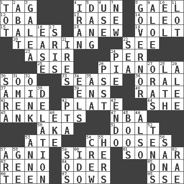 ACROSS 1. Label 4. Goddess of spring and wife of Bragi 8. Highlander 12. Chief or king in Benin or Nigeria 13. To erase 14. Butter sub 15. Falsehoods 18. Afresh 19. Electrical Unit 20. Lacerating 22. Perceive with the eye 23. SW Saudi Arabia district 24. For each 25. Compass dir. 26. Player piano 30. "Barney Miller" actor Jack 33. Gospel singer Marvin 36. Spoken 37. Among 39. Followers of ems 40. Assign a rank or rating to 41. French philosopher Descartes 42. Food holder 44. A female animal or person 45. Short socks 47. Basketball assoc. 50. Alias (abbr.) 51. Stupid person 53. Had dinner 54. Opts 57. Hindu god of fire 59. Beget 61. Echolocation 63. Former U.S. Attorney General Janet 64. River in Europe 65. Heredity factor (abbr.) 66. Adolescent 67. Sty mamas 68. Compass dir. DOWN 1. Small child 2. Blind as ____ 3. An organ shaped like a helmet 4. SW Asia republic 5. Mild oath, euphamism for damn 6. Purpose 7. ___ Haven, CT 8. State head 9. _ vera 10. Snakelike fish 11. Car dealer's back yard 16. Comfort 17. Indian titles of respect 21. Angers 22. Ocean 24. Sliced dessert 26. Inconspicuous attention getter 27. Mouths or openings 28. Thin strip of wood or metal 29. Toward shelter 30. "Two Mules for Sister ____" 31. Sign of something about to happen 32. Pig sound 34. Snakelike fish 35. Santa ___, CA 38. Conveyance 42. Parent Teacher Association (abbr.) 43. Inside; within (prefix) 46. Supplement with great effort 48. Expressions of contempt or scorn 49. In addition 52. Watches over 53. Singer Murray 54. Ship's personnel 55. Possessive pronoun 56. Without 57. Tate display 58. Turn to the right 59. Mayday 60. Wedding promise 62. Actress Charlotte