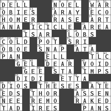 ACROSS 1. Small valley 5. Christmas carol 9. Armed conflict 12. Off-Broadway awards 14. Like ___ of sunshine 15. Environmental prefix 16. Home run 17. Raze (variant) 18. Nonscientific branch of learning 19. Santa ___, CA 20. Ice on the eave 23. Length times width 24. Austrian river, tributary to the Danube 25. Tennis shots 27. Having a low temperature 30. Plant holder 32. _ Lanka 33. Mitch Miller's instrument 34. Fastener 36. "One Day ___ Time" 38. Baking dish 39. Pipe bend 40. Affectionate concern, for short 43. Set 46. Letter starter 48. Empty area or space 49. Turn to the right 51. R.R. building 52. Naughty children 53. "You Light Up My Life" star Conn 54. Singer James 56. "Vaya con ____" 58. College papers 61. Had dinner 64. Begley and Asner 65. Son of Odin 66. NE Netherlands city 68. Born 69. San ____ (Riviera town) 70. Swept the length of 71. Small amount or degree 72. Angers 73. Baking dishes DOWN 1. Capital of the state of Qatar 2. Inky black, to poets 3. Pale green bean 4. Area sheltered from the wind 5. Drug cop 6. Taken by mouth 7. Artist's stands 8. Potassium hydroxide 9. Erodes 10. Measure of real estate 11. Roll call or roster of names 13. Indian titles of respect 21. Smile enhancers 22. Pressed 23. "This won't hurt ____!" 24. Binary compound 26. Mouth or opening 27. Police officer (slang) 28. Chief or king in Benin or Nigeria 29. Yearn 31. Falsehoods 35. Food holders 37. Smallest unit of an element 41. Mouth edge 42. Music discs 44. The front part of a cuirass 45. Directed 47. Assign a rank or rating to 48. By way of 50. One or the other of two 53. Administered medicine 55. Russian ruler of old 56. Scratch 57. It may be bright or harebrained 59. Dwelling 60. Greek god of love 61. "____ silly question..." 62. Adolescent 63. Conclusions 65. Three (prefix) 67. Plant excrement