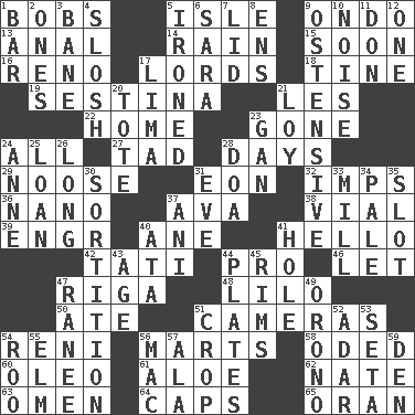 ACROSS 1. Moves up and down 5. Small island 9. Southwest Nigerian state 13. Of or related to the anus 14. Precipitation 15. Within a short period 16. Former U.S. Attorney General Janet 17. Titled peers of a realm 18. Prong on a fork 19. French poetic form 21. French article 22. Residence 23. Went 24. 100% 27. Small amount or degree 28. 24-hour periods 29. Trap for birds or small mammals 31. A really long time 32. Naughty children 36. Billionth: prefix 37. Actress Gardner 38. Small bottle 39. Engineer (abbr.) 40. A saturated hydrocarbon 41. Phone greeting 42. Jacques of French films 44. Adept person 46. Allow 47. Capital of Latvia 48. _ and Stitch 50. Had dinner 51. Devices for capturing images 54. Painter Guido (1575-1642) 56. Shops 58. Wrote a lyric poem 60. Butter sub 61. Medicinal plant 62. Nathan's nickname 63. Sign of something about to happen 64. Smile enhancers 65. NW Algerian seaport DOWN 1. Soap unit 2. Washington bills 3. Object of repulsion 4. Agitate, as a liquid 5. Pressed 6. "Two Mules for Sister ____" 7. Hat (slang) 8. Followers of ems 9. Clearly or manifestly demonstrative 10. Annoying sound 11. Spanish title 12. Single 17. Pale green bean 20. Carryall 21. Myrna of the movies 23. Separate the seeds from cotton 24. Queen of England 1702-14 25. Grant temporary use of 26. Having great length 28. ___ good deed 30. Making a chance decision by using lots 31. First lady 33. Place where flour is made 34. Diluted with white 35. Notch 37. Black tropical American cuckoo 40. "One Day ___ Time" 41. Hollow 43. Personal question 44. Food holders 45. Basketball hoops 47. The wife of a rajah (variant) 49. U. of Maine site 51. Riding implement 52. The sixth month of the Jewish calendar 53. Stalk of a moss capsule 54. Friend of Pooh 55. Shade tree 56. Apple computer (short form) 57. Insect wing 59. Lair