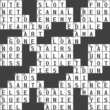ACROSS 1. Shoshoni 4. Groove 8. From 11. Fish or hair follower 12. Lessep's creation 14. Reuben's nickname 15. "Tell ____ the Marines!" 17. Foe 18. Spanish pot 19. Pulling into pieces 21. Peak District village in England 23. Tate display 24. Housemaid (var.) 25. Went 27. Grant temporary use of 30. Allow head to fall sleepily 31. Flight of steps 34. Make lace 37. Born 38. Assad's deity 39. Corn or form start 40. Double-curved letter 41. Bathroom 43. Small child 44. Sliced desserts 45. Goddess of spring and wife of Bragi 47. Greek goddess of the dawn 49. Black tropical American cuckoo 50. Before Barbara or Clara 52. Core 56. Otherwise 57. Scores awarded for successful feats 60. Hindu Mythology: god of death 61. Institutes legal proceedings 62. Bert's buddy 63. Consenting reply 64. Snakelike fish 65. Arabian gulf 66. Perceive with the eye DOWN 1. A single undivided whole 2. False hair 3. Singer James 4. Odor 5. Austrian-born American filmmaker Fritz 6. Single 7. Scottish cap 8. Chap (slang) 9. Court order 10. Chief or king in Benin or Nigeria 13. Potassium hydroxide 14. Wander 16. Northwest Algerian city 20. Angers 22. One of the 12 tribes of Israel 25. Moves 26. Lyric poems 27. Ms. Damita and namesakes 28. Spoken 29. American tennis player Robert 30. Compass dir. 32. Jacques of French films 33. Medicinal plant 34. Ballerina skirt 35. Soon (poet.) 36. Teat (slang) 42. Canisters 44. Pacific Standard Time (abbr.) 46. South Vietnam president (1954) 47. Artist's stand 48. Singles 49. NE Netherlands city 50. Turn sharply 51. Mature 52. Writer Wiesel 53. Negative votes 54. Algonquian 55. Relaxation 56. Compass dir. 58. Mouth or opening 59. Added to
