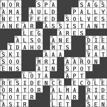 ACROSS 1. And not 4. Health resort 7. Droops 11. Housemaid (var.) 12. Old (Scot.) 13. Chummy 14. Fish or hair follower 15. Nourish 16. Finds the solution 17. Approach 19. Helper 21. Part of a journey 23. Ancient Greek god of war 24. In addition 25. A saturated hydrocarbon 26. Expire 29. Potato state 30. Mountains (abbr.) 31. Retirement account (abbr.) 32. What Jean-Claude Killy likes to do 33. Auto club (abbr.) 34. Large container 35. "Barney Miller" actor Jack 36. Medical imaging device (abbr.) 37. Composer Copland 40. Followers of ems 41. The 18th letter of the Arabic alphabet 42. Specific locale 43. Globular water bottle used in Asia 45. Fitting 46. Dwelling 51. Learning spot: Fr. 55. Speaker 56. _ mater 58. To free from 59. Carrier 60. One who doesn't tell the truth 61. "___ Maria" 62. SW Saudi Arabia district 63. Allow 64. Elected rep. DOWN 1. Grandmother 2. Presage 3. Assign a rank or rating to 4. Institute legal proceedings 5. Entreaty 6. Does sums 7. Table seasonings 8. Inventor's middle name 9. Small, secluded valley 10. System (abbr.) 12. Anew 13. Airs 16. Titles for men of rank and authority 18. Silent film actress Nazimova 20. Before Barbara or Clara 22. Thick or sticky substance 24. Goodbye (Sp.) 25. At full speed 26. A piece of turf (Scot.) 27. SW Asia republic 28. Ingest 29. Picture 32. Compass dir. 33. Believer in; advocate of (suffix) 36. Mother 37. White ___ sheet 38. Become visible 39. College mil. group 43. 61 cubic inches 44. Aroma 46. Round or rotation of duties 47. Greek god of love 48. Suttee (variant) 49. Give a ring to 50. Writer Wiesel 52. Mouths or openings 53. Not recorded 54. Paradise 57. Floor covering