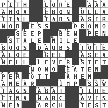 ACROSS 1. Heart or essence 5. Old wives' tales, e.g. 9. Auto club (abbr.) 12. Small Philippine buffalo 13. Inky black, to poets 14. Spanish pot 15. Slanted text style (abbr.) 16. Bar bills 17. SW Saudi Arabia district 18. Dreamland 19. Curvy letter 21. U. of Maine site 22. Ooze 24. Benjamin's nick name 26. Writing instrument 27. Lacking originality or spontaneity 28. The longest river in the world 29. Expressions of contempt or scorn 30. Applies to a surface 32. Haul 36. _ vera 37. Set 38. At sea 39. 1994 drama film starring Jodie Foster 40. Prying instrument 42. Proofreading order 43. Words to Nanette 44. Eroded 46. For each 49. Baseball player Mel 50. So be it 51. Approach 53. Mischievous child 54. Compass dir. 57. Labels 58. Blind as ____ 61. Become fatigued 62. Inactive volcano in Sicily 63. Drug cop 64. Deliberation 65. Teachers' org. 66. Bowlike part 67. Trial DOWN 1. Ache 2. To the inside or interior of 3. Inedible or poisonous agaric 4. Actor Linden 5. Allows 6. Chief or king in Benin or Nigeria 7. Director Reiner 8. Followers of ems 9. Columnist Joseph or Stewart 10. Place in a line 11. Composer Copland 14. Rowing implement 19. Snakelike fish 20. Hurried 21. Single 23. Artist's stand 24. The Good Book 25. Raised railways 27. Flatfish 28. New (sp.) 29. Prohibit 31. Rep 32. Clothes sense 33. Clearly or manifestly demonstrative 34. Adolescent 35. Consume 40. Car dealer's back yard 41. 480, 500 or 516 sheets of paper 43. Or not 45. Electrical Unit 46. Eucharist need 47. Related on the mother's side 48. Canadian anthropologist Darnell 52. White ___ sheet 53. Hankering 55. Indian titles of respect 56. Compass direction 58. Santa ___, CA 59. Drinking establishment 60. Curve 61. Make lace