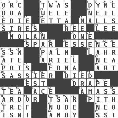 ACROSS 1. The grampus (Milton) 4. It was, poetically 8. Unit of force 12. ___ good deed 13. Ubangi River tributary 14. Famous astronaut Armstrong 15. Singer Brickell 17. Singer James 18. Shopping centers 19. Begets 21. To riddle 23. Area sheltered from the wind 24. Pitcher Ryan 26. Single 28. Practice fight 30. Substance 34. Compass dir. 37. Inside of hand 39. Cowardly lion portrayer 40. Had dinner 41. Satellite of Uranus 43. Teachers' org. 44. Plant holders 46. Pulitzer Prize-winning author Ferber 47. Tate display 48. More impudent 51. Passed on 54. Eastern Standard Time (abbr.) 55. Window treatment 58. Afternoon social gathering 61. Adept person 63. Collect or gather 65. Zeal 67. Russian ruler of old 71. Heart or essence 72. Not kosher 73. Unadorned 74. Modern: prefix 75. Is not 76. "60 Minutes" Commentator Rooney 77. Fast jet (abbr.) DOWN 1. Lyric poems 2. "The Thinker" sculptor 3. Capital of Egypt 4. Third day of the wk. 5. Soggy 6. The first octave above the treble staff 7. Shrivel 8. Heredity factor (abbr.) 9. Shout 10. The longest river in the world 11. Otherwise 16. Snakelike fish 18. Not women's 20. Plant excrement 22. Greek goddess of the dawn 25. California wine valley 27. Snakelike fish 29. More valued for its uncommonness 30. Make improvements or corrections to 31. Grandmother 32. "Mermaids" star 33. Part of Q.E.F. 34. Plant excrements 35. Portico 36. Soaks 38. Hat (slang) 42. Put down 45. Compass dir. 49. Austrian river, tributary to the Danube 50. And so on (abbr.) 52. Epoch 53. Moist 56. Aches 57. _____ Park, CO 58. Jacques of French films 59. Blunders 60. Arabian gulf 62. Inactive volcano in Sicily 64. Guess 66. Often (poetically) 68. Player for Phoenix 69. Say or write further 70. Marina Del _, California