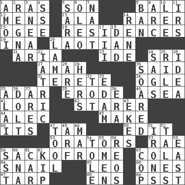ACROSS 1. Ancient river in northeast Turkey 5. Male child 8. Indonesian resort city 12. Not women's 13. Wing 14. Less widely known 15. Double curve, resembling the letter S 16. Dwellings 19. _ tizzy (2 wds.) 20. Of or relating to Laos or its people 21. Operatic vocal solo 23. Binary compound 24. Indian title of respect (Mr.) 27. Nanny 30. Expressed in words 31. Cylindrical with tapered ends 34. Stare at amorously 35. The sixth month of the Jewish calendar 38. Wear away 40. At sea 41. Australian parrot (variant) 42. A viewer who gazes fixedly 44. Actor Baldwin 45. Create 46. It is 47. Scottish cap 50. Prepare for publication 53. Speakers 57. Actress Charlotte 59. Italian handbag shop? 63. Root beer relative 64. Slow-paced one 65. Lion 66. Singles 67. Canvas cover 68. Followers of ems 69. Inconspicuous attention getter DOWN 1. Mine, in Marseilles 2. Canadian anthropologist Darnell 3. Approach 4. Compass dir. 5. "Two Mules for Sister ____" 6. Butter sub 7. Political cartoonist Thomas 8. Forbid 9. Curve 10. Area sheltered from the wind 11. Big collection agency 14. French philosopher Descartes 17. One more than two 18. June honoree 20. Unable to walk 22. Of or pertaining to medicine 24. Droops 25. Cause heat under the collar 26. The main thing one is thinking about 28. "We ___ not amused" (Victoria) 29. Possessive pronoun 30. Flew 32. Small child 33. Dutch treat 35. Mountain range southwest of Kyrgyzstan 36. Stupid person 37. Ancient Greek god of war 39. Epoch 43. Supplements with great effort 47. Utensil 48. Sandy's bark 49. Impair 51. Metal shackles 52. Lies 54. Lacquered or enameled metalware 55. Sign of something about to happen 56. Vintage cars 58. 90 degrees 59. Fast jet (abbr.) 60. Santa ___, CA 61. Auto 62. Monetary unit of Laos 63. Police officer (slang)