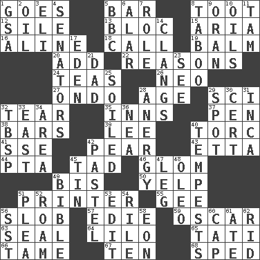 ACROSS 1. Leaves 5. Drinking establishment 8. A blast of a horn 12. Drop; flow; fall 13. Coalition 15. Roberta Peters solo 16. Place in a line 18. Give a ring to 19. Lip ointment 20. Say or write further 22. Thinks logically 24. Afternoon social gatherings 26. Modern: prefix 27. Southwest Nigerian state 28. Grow older 29. _-fi 32. Rend 35. Restaurants 37. Animal enclosure 38. Soap units 39. Area sheltered from the wind 40. Torque (variant) 41. Compass dir. 42. Lightbulb-shaped fruit 43. Singer James 44. Parent Teacher Association (abbr.) 45. Small boy 46. Seize upon or latch onto something 49. Altar cloth linen 50. Sharp bark 51. Hard copy producer 55. Unit of force equal to gravity 56. Oscar Madison type 57. Singer Brickell 59. Witty Wilde 63. Lick closed 64. _ and Stitch 65. Jacques of French films 66. Not wild 67. "___ Little Indians" 68. Moved rapidly DOWN 1. Girls' org. (abbr.) 2. Petroleum 3. Connecticut Ivy Leaguer 4. Elected representatives 5. English channel? 6. Having or resembling wings 7. Hero or heavy, e.g. 8. Off limits 9. NW Algerian seaport 10. Lubricates 11. Scottish cap 14. Rigngs loudly 17. Paradise 21. June honoree 23. Observe 25. Dirtied 28. Disorder of the immune system 29. Blemish 30. Certainty 31. South American Indian 32. Cook's measure (abbr.) 33. Compass direction 34. Length times width 36. Teachers' org. 40. Storms 42. Soft color 45. Shallow baking pan 47. Part of a journey 48. Margarine 49. The Good Book 51. Entreaty 52. Wander aimlessly 53. Prepare for publication 54. Cause heat under the collar 56. Fast jet (abbr.) 58. Age 60. Head covering 61. Had dinner 62. To free from