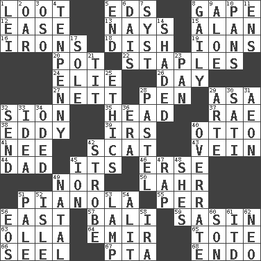 ACROSS 1. Spoils 5. Begley and Asner 8. Stare wonderingly 12. Comfort 13. Negative votes 15. ____ Jay Lerner 16. Metal shackles 18. Food container 19. Charged atoms 20. Plant holder 22. Paper fasteners 24. Writer Wiesel 26. 24 hours 27. Remaining after all deductions 28. Writing instrument 29. White ___ sheet 32. The Jewish people; Israel 35. Froth on beer 37. Actress Charlotte 38. Whirlpool 39. Big collection agency 40. Von Bismarck 41. Born 42. Jazz singing style 43. Distinctive style or manner 44. June honoree 45. ___ a Wonderful Life 46. Celtic language 49. Or not 50. Cowardly lion portrayer 51. Player piano 55. For each 56. Compass direction 57. Indonesian resort city 59. Indian antelope 63. Water jar 64. Arab leader 65. Carryall 66. Sew up the eyelids of hawks and falcons 67. Parent Teacher Association (abbr.) 68. Inside; within (prefix) DOWN 1. Flowery wreath 2. Rowing implement 3. Bear (Spanish) 4. 3-inch nail 5. Conclude 6. Raised platform 7. System (abbr.) 8. Lightheartedly 9. Medicinal plant 10. Zero-star reviews 11. Followers of ems 14. Cast a shadow over 17. Flatfish 21. Teat (slang) 23. Baking dish 25. Value system 28. Soft color 29. Johnson of "Laugh-In" 30. Suttee (variant) 31. Period of immesurable duration 32. Transmit 33. The main thing one is thinking about 34. Wrote a lyric poem 36. Period 40. Make much ado about nothing 42. Disco prop 45. Electrically charged atom 47. Strike 48. "______ My Girl" (Turtles hit) 49. Brizilian seaport 51. Light colored 52. Capri or Wright 53. Desk light 54. Came down and settled, as after flight 56. Greek goddess of the dawn 58. Retirement account (abbr.) 60. Male offspring 61. It would 62. Modern: prefix