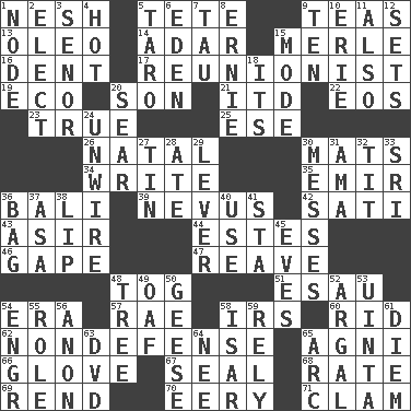 ACROSS 1. Soft 5. False hair 9. Beverages made from leaves 13. Margarine 14. The sixth month of the Jewish calendar 15. Haggard of country music 16. Incision 17. One who advocates reunion 19. Environmental prefix 20. Manchild 21. It would 22. Greek goddess of the dawn 23. Loyal 25. Compass dir. 26. Relating to or accompanying birth 30. Floor protectors 34. Compose 35. Independent ruler or chieftain 36. Indonesian resort city 39. Mole, birthmark 42. Suttee (variant) 43. SW Saudi Arabia district 44. _____ Park, CO 46. Stare wonderingly 47. Break or tear apart 48. Coat; cloak 51. He sold his birthright 54. Period 57. Actress Charlotte 58. Big collection agency 60. To free from 62. Unrelated to defense, as in spending 65. Hindu god of fire 66. Michael Jackson trademark 67. Lick closed 68. Assign a rank or rating to 69. Tear apart 70. Suggestive of the supernatural 71. Dollar (slang) DOWN 1. Thickened enlargement 2. Opt 3. Sir (Sp.) 4. Being at a high temperature 5. Pacific island yam 6. Genesis locale 7. The 19th letter of the Greek alphabet 8. Bert's buddy 9. Nine, plus one 10. One of the Great Lakes 11. In addition 12. Arranges properly for use 15. Method 18. It is 20. Singe 24. Undo the wiring of 27. Metal container 28. Had dinner 29. Prying instrument 30. Makes clutter 31. Housemaid (var.) 32. Teat (slang) 33. Indian title of respect (Mr.) 36. Container for groceries 37. White ___ sheet 38. Mouth edge 40. Purpose 41. R.R. building 45. Nights before holidays 48. Family _ (genealogy) 49. Clumsy lout 50. Honkers 52. Therefore, facetiously 53. National forest in Provo, Utah 54. Engineer (abbr.) 55. Hero or heavy, e.g. 56. At once, immediately (arch.) 58. Austrian river, tributary to the Danube 59. Have confidence or faith in 61. South Vietnam president (1954) 63. Movie disc 64. Born 65. Curve