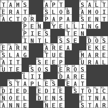 ACROSS 1. Scottish caps 5. Fitting 8. Table seasoning 12. Part of Q.E.F. 13. Oscar Madison type 15. Mine, in Marseilles 16. Thespian 18. Dad 19. Emitted 20. Writing instrument 22. Crying or shouting loudly 24. Sliced desserts 26. "___ Little Indians" 27. International (abbr.) 28. Compass dir. 29. Two (Sp.) 32. Merit 35. Type of rug 37. Supplement with great effort 38. Volcanic refuse 39. Third day of the wk. 40. Female horse 41. Small island 42. Ooze 43. Mountain range 44. Shoshoni 45. Mayday 46. Greek god of love 49. Cards in a Roman deck? 50. Have the gumption 51. Paper fasteners 55. Ingest 56. Passed on 57. Singer Brickell 59. Unemotional 63. Christmas carol 64. Lairs 65. Inactive volcano in Sicily 66. Queen of England 1702-14 67. Born 68. Play the lead DOWN 1. Beverage made from leaves 2. Curve 3. Floor protector 4. Halting 5. Cleo's killer 6. Romp 7. Drink excessively 8. Indian antelope 9. So be it 10. Having great length 11. Teat (slang) 14. Greek mezzo-soprano Agnes 17. It's straight from the horse's mouth 21. Fish or hair follower 23. Area sheltered from the wind 25. Chalkboards 28. Oozed 29. Letter starter 30. Gumbo ingredient 31. Stitch closed the eyes of (a falcon) 32. Son of Isaac 33. Set down 34. Assign a rank or rating to 36. Sorrow 40. French bagpipes 42. Dirtied 45. Small drink 47. Actress Charlotte 48. Mouths or openings 49. Dipping utensil 51. The Jewish people; Israel 52. Adolescent 53. Paradise 54. Trig term 56. Heredity factor (abbr.) 58. Compass dir. 60. Baseball player Mel 61. _ tizzy (2 wds.) 62. Auto