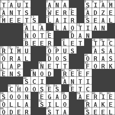 ACROSS 1. "Change" in Tahitian 5. Santa ___, CA 8. Thailand, formerly 12. Pismires 13. Past tense of be (plural) 15. Edge tool used to cut and shape wood 16. Confronts 18. Den 19. Lick closed 20. Chicken ___ king 22. Of or relating to Laos or its people 24. Brief written record 26. Daniel's nick name 27. Fermented drink made from hops 28. Allow 29. Nervous spasm 32. Tall New Zealand timber tree 35. Musical composition 37. White ___ sheet 38. Taken by mouth 39. Two (Sp.) 40. Mouths or openings 41. Pet locale 42. Remaining after all deductions 43. Tined utensil 44. Followers of ems 45. Lower and raise head in agreement 46. Coral collection 49. _-fi 50. Against 51. Opts 55. And so on (abbr.) 56. Within a short period 57. Mild oath 59. Nest on high 63. Rounded earthenware pot or jar 64. Grain storage tower 65. Immoral or dissolute person 66. River in Europe 67. R.R. building 68. Stitch closed the eyes of (a falcon) DOWN 1. Scottish cap 2. A saturated hydrocarbon 3. Shoshoni 4. Byzantium, centuries later 5. Leather borer 6. Actress Patricia 7. Roberta Peters solo 8. Indian antelope 9. The content of cognition 10. Muslim summons to prayer 11. Cartoonist voice _ Blanc 14. Eats (away) 17. A type of plum 21. Had dinner 23. Make lace 25. Worn away 28. A period of five years 29. Pacific island yam 30. Austrian river, tributary to the Danube 31. Keg 32. Hero or heavy, e.g. 33. SW Asia republic 34. Atlas contents 36. Plant holder 40. Persons of authority 42. Annoying sounds 45. Non-commissioned officer (abbr.) 47. Compass dir. 48. Singer James 49. Underwater navigation system 51. Chilled 52. Hollow 53. The front part of a cuirass 54. Table seasoning 56. "Barney Miller" actor Jack 58. ___ good deed 60. Actress Charlotte 61. Mamie's mate 62. Snakelike fish