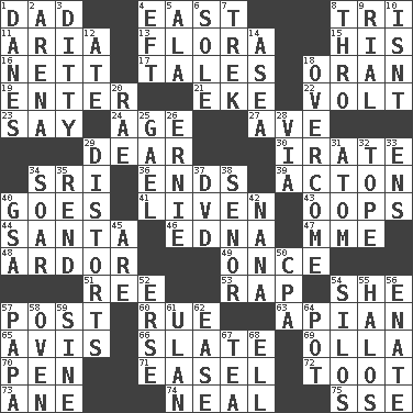 ACROSS 1. June honoree 4. 90 degrees 8. Three (prefix) 11. Roberta Peters solo 13. Plants 15. Part of HMS, perhaps 16. Remaining after all deductions 17. Lies 18. Northwest Algerian city 19. Keyboard key 21. Supplement with great effort 22. Electrical Unit 23. Declare 24. Personal question 27. "___ Maria" 29. Letter starter 30. Feeling or showing extreme anger 34. _ Lanka 36. Conclusions 39. NE Massachussets city 40. Leaves 41. Make or become more lively 43. I made a mistake 44. Before Barbara or Clara 46. Pulitzer Prize-winning author Ferber 47. Madame (abbr.) 48. Zeal 49. Single time 51. To riddle 53. Strike 54. A female animal or person 57. Mail 60. Sorrow 63. Bee-related 65. Deliberation 66. Chalkboard 69. Spanish pot 70. Writing instrument 71. Artist's stand 72. A blast of a horn 73. A saturated hydrocarbon 74. Anneal 75. Compass dir. DOWN 1. Natives or inhabitants of Denmark 2. Sports stadium 3. Short, simple song 4. Lizard (obsolete) 5. Insect wing 6. Not divided or shared with others 7. Long journey 8. Through, poetically 9. Monetary unit of Yemen 10. Is not 12. Had dinner 14. Toward the sea 18. Conquer 20. Actress Charlotte 25. Highlander 26. Bert's buddy 28. By way of 29. What propaganda does 31. Tiny particle 32. Drink excessively 33. Followers of ems 34. Fly high 35. Tear apart 37. Movie disc 38. Sir (Sp.) 40. Girls' org. (abbr.) 42. Grandmother 45. "We ___ not amused" (Victoria) 50. Numbers guy (abbr.) 52. Celtic language 54. Grain storage towers 55. Radiant circles of light 56. Maternal 57. Dad 58. Baking chamber 59. Trig term 61. Uhlan (variant) 62. Relaxation 64. Cooking vessel 67. Afternoon social gathering 68. Pipe bend