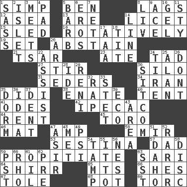 ACROSS 1. Simple or foolish person 5. Benjamin's nick name 8. Straggles 12. Toward the sea 13. "We ___ not amused" (Victoria) 14. It is permitted: Lat. 15. Downhill vehicle 16. Rotating or pertaining to rotation 19. Arrange properly for use 20. Choose not to consume 21. Russian ruler of old 23. Had dinner 24. Small amount or degree 27. Move through with a circular motion 30. Grain storage tower 31. Spring feasts 34. SW Asia republic 35. "You Light Up My Life" star Conn 38. Maternal 40. Portable shelter 41. Lyric poems 42. Medicinal drug used to evoke vomiting 44. Monthly bill 45. "Corrida" creature 46. Floor covering 47. Electrical Unit 50. Independent ruler or chieftain 53. French poetic form 57. Male parent 59. Appease 63. Indian skirt 64. Bake eggs in their shells 65. Mountains (abbr.) 66. "______ My Girl" (Turtles hit) 67. Lacquered or enameled metalware 68. Cooking vessel 69. Torque (variant) DOWN 1. Backtalk 2. Small island 3. Confronts 4. Groovy apt. 5. Sharp remark 6. Greek god of love 7. Remaining after all deductions 8. 54 in ancient Rome 9. Adept person 10. Set 11. Filthy place 14. Actor's bit 17. American Automobile Association (abbr.) 18. Teat (slang) 20. Johnson of "Laugh-In" 22. Aid 24. Become fatigued 25. Actor Alda or Thicke 26. Do not 28. Binary compound 29. Painter Guido (1575-1642) 30. "Cheers" or "Ellen" 32. Reproach for some lapse or misdeed 33. Proofreading order 35. Dormintory (informal) 36. The main thing one is thinking about 37. Incision 39. Environmental prefix 43. Length times width 47. SW Saudi Arabia district 48. Was introduced to 49. Air pressure measure (abbr.) 51. Potato state 52. More uncommon 54. Pack (down) 55. "Tell ____ the Marines!" 56. A home for chicks 58. Compact _ 59. Pacific Standard Time (abbr.) 60. 17th letter of the Greek alphabet 61. Lubricate 62. Before (prefix) 63. Fast jet (abbr.)
