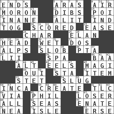 ACROSS 1. Conclusions 5. Ancient river in northeast Turkey 9. Atmosphere 12. Person of subnormal intelligence 14. Rights 15. Luau course 16. Lacking in sense or substance 17. Came down and settled, as after flight 18. Indiana (abbr.) 19. Coat; cloak 20. Tallied 23. Comfort 24. Burn to charcoal 25. Flair 27. Froth on beer 30. Soggy 32. Two (Sp.) 33. High mountains 34. Messy guy 36. Parent Teacher Association (abbr.) 38. Cards in a Roman deck? 39. Health resort 40. Sound made by sheep 43. Keyboard modifier key 46. Snakelike fish 48. Wise men 49. Fr. "Yes" 51. R.R. building 52. Detail 53. Proofreading order 54. A hard, heavy blow 56. South American Indian 58. Cause to be 61. Affectionate concern, for short 64. By way of 65. Silvers or Donahue 66. Failure 68. 100% 69. Oceans 70. Related on the mother's side 71. Teachers' org. 72. Small island 73. Celtic language DOWN 1. Give off 2. Words to Nanette 3. To trail on the ground 4. Boy, to dad 5. The sixth month of the Jewish calendar 6. Cause heat under the collar 7. Stayed 8. Fast jet (abbr.) 9. Bee-related 10. Charged particles 11. Travel on or in a vehicle 13. Soft 21. Crow sounds 22. Threatening words 23. Compass direction 24. Music discs 26. Chop off 27. Actor Linden 28. Connecticut Ivy Leaguer 29. Capital of Western Samoa 31. Drinks excessively 35. Greek mezzo-soprano Agnes 37. Blind as ____ 41. Grow older 42. Direct toward a target or goal 44. Globular water bottle used in Asia 45. Third day of the wk. 47. Table seasoning 48. Russian fighter aircraft 50. Skin irritations 53. Any of the three canals of the cochlea 55. Ubangi River tributary 56. "Terrible" tsar 57. Mediterranean tributary 59. Monetary unit of Yemen 60. Otherwise 61. Russian ruler of old 62. Allows 63. Algonquian 65. Air pressure measure (abbr.) 67. Single