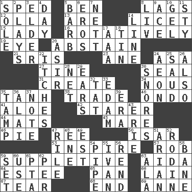 ACROSS 1. Broke a traffic law 5. Benjamin's nick name 8. Fails to keep up a pace 12. Spanish pot 13. "We ___ not amused" (Victoria) 14. It is permitted: Lat. 15. Kenny Rogers chart-topper in '80 16. Happening in regular succession 19. Sight organ 20. Choose not to consume 21. Indian titles of respect 23. One (Scot) 24. White ___ sheet 27. Prong on a fork 30. Lick closed 31. Make 34. Common sense 35. Hyperbolic tangent 38. Swap 40. Southwest Nigerian state 41. Medicinal plant 42. A viewer who gazes fixedly 44. Floor coverings 45. Female horse 46. Sliced dessert 47. Portuguese money of account (variant) 50. Austrian river, tributary to the Danube 53. Heighten or intensify 57. Director Reiner 59. Supplying deficiencies 63. Opera by Verdi 64. First name in cosmetics 65. Baking dish 66. (Had) reclined 67. Pull into pieces 68. Conclude 69. Queen of England 1702-14 DOWN 1. Flatfish 2. Frolics 3. A person who is older than you are 4. 24 hours 5. Sharp remark 6. Greek god of love 7. Remaining after all deductions 8. 54 in ancient Rome 9. Adept person 10. Set 11. Filthy place 14. Actor's bit 17. American Automobile Association (abbr.) 18. Shallow baking pan 20. SW Saudi Arabia district 22. Skin irritations 24. Age 25. Saudi Arabian king (1953-1964) 26. In addition 28. Fish or hair follower 29. Hearing organs 30. Sounds asleep 32. Make lace 33. Dutch treat 35. Pack (down) 36. Jai _ 37. Brief written record 39. Period 43. 4th largest of the Great Lakes 47. Cause heat under the collar 48. Compass dir. 49. Eastern Standard Time (abbr.) 51. Believer in; advocate of (suffix) 52. "The Thinker" sculptor 54. Corncob 55. "Terrible" tsar 56. Tear apart 58. Object of repulsion 59. Put into a specified state 60. Purpose 61. Parent Teacher Association (abbr.) 62. For each 63. Chicken ___ king