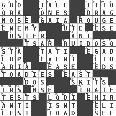 ACROSS 1. Thick or sticky substance 4. Lie 8. "Tell ____ the Marines!" 12. Mouth or opening 13. Singles 14. To trail on the ground 15. Sense of smell 17. Greek goddess of the earth (variant) 18. Makeup applied to the cheeks 19. Foe 21. Shoshoni 23. Compass dir. 24. Flexible twig of a willow tree 26. Black tropical American cuckoo 28. Russian ruler of old 30. Boisterous (Brazilian Portuguese) 34. R.R. building 37. Jacques of French films 39. Mild oath 40. Chop off 41. Incident 43. Flaplike covering 44. Roberta Peters solo 46. Comfort 47. Begley and Asner 48. Sycophants 51. 90 degrees 54. Two (Sp.) 55. Burlesque acts 58. Big collection agency 61. Overdraft (abbr.) 63. Feeling or showing extreme anger 65. Trials 67. Farming town in central California 71. Independent ruler or chieftain 72. Against 73. Is not 74. Connecticut Ivy Leaguer 75. For fear that 76. Frog relative 77. Perceive with the eye DOWN 1. Went 2. U. of Maine site 3. Fertile tracts in a desert 4. Coat; cloak 5. Santa ___, CA 6. Flowery wreath 7. He sold his birthright 8. Wedding promise 9. Loyal 10. Labels 11. Double curve, resembling the letter S 16. Give off 18. Painter Guido (1575-1642) 20. Consenting reply 22. The 19th letter of the Greek alphabet 25. Pace 27. Binary compound 29. All-night dance parties 30. Wash lightly 31. Stare 32. Stated 33. Likelihood 34. Narrow board 35. "Corrida" creature 36. Capital of Western Samoa 38. Beverage made from leaves 42. Beverages made from leaves 45. Find the sum of 49. Charged atoms 50. Curvy letter 52. What Jean-Claude Killy likes to do 53. Hoop that covers a wheel 56. Makes less strong or intense 57. Vertical member of a panel or frame 58. Slanted text style (abbr.) 59. French philosopher Descartes 60. Fast planes 62. Sudden quick movement 64. 4th largest of the Great Lakes 66. Teat (slang) 68. Bear (Spanish) 69. Heredity factor (abbr.) 70. It would