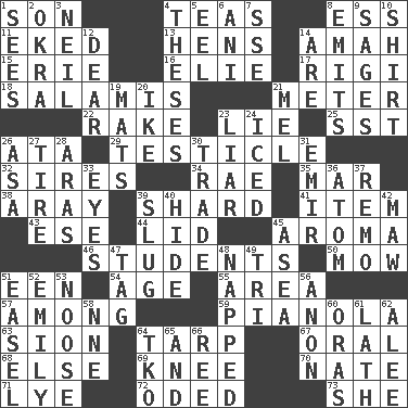ACROSS 1. Male child 4. Beverages made from leaves 8. Double-curved letter 11. Supplemented with great effort 13. Coop moms 14. Wet nurse 15. One of the Great Lakes 16. Writer Wiesel 17. Swiss mountan, "Queen of the Mountains" 18. Deli grouping 21. Distance measurement 22. Libertine 23. Untruth 25. Fast jet (abbr.) 26. _ moment's notice (2 wds.) 29. A testis 32. Titles for men of rank and authority 34. Actress Charlotte 35. Spoil 38. Like ___ of sunshine 39. Pottery fragment 41. A distinct part 43. Compass dir. 44. Hat (slang) 45. Odor 46. SAT takers 50. Cut the grass 51. Car or cant ending 54. Personal question 55. Type of rug 57. Amid 59. Player piano 63. The Jewish people; Israel 64. Canvas cover 67. Taken by mouth 68. Otherwise 69. Leg joint 70. Nathan's nickname 71. Potassium hydroxide 72. Wrote a lyric poem 73. A female animal or person DOWN 1. Perceives with the eye 2. Gumbo ingredient 3. Famous astronaut Armstrong 4. College papers 5. Snakelike fish 6. Black tropical American cuckoo 7. Compass dir. 8. Gives off 9. Gurus 10. Chest covering 12. Letter starter 14. "We ___ not amused" (Victoria) 19. Floor coverings 20. D.D.E's nickname 21. Cartoonist voice _ Blanc 23. One who doesn't tell the truth 24. On the rocks 26. White ___ sheet 27. Hoop that covers a wheel 28. Caspian sea tributary 30. Buy and sell 31. Independent ruler or chieftain 33. Snake ____ (dice throw) 36. Smallest unit of an element 37. San ____ (Riviera town) 39. Strike heavily 40. Flintstone garb 42. Opening into something insatiable 45. At sea 47. Label 48. Slept 49. Three (prefix) 51. Artist's stand 52. Poet Dickinson 53. Trap for birds or small mammals 56. Soon (poet.) 58. Compass dir. 60. Mouths or openings 61. Thin strip of wood or metal 62. Toward shelter 64. Ring climax 65. Also 66. To riddle