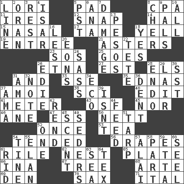 ACROSS 1. Australian parrot (variant) 5. Groovy apt. 8. Tax preparer (abbr.) 11. Angers 12. Fastener 14. Actor Linden 15. Relating to the nose 17. Not wild 18. Shout 19. Main course 21. Michaelmas daisies 23. Mayday 25. Travels 26. Inactive volcano in Sicily 27. Eastern Standard Time (abbr.) 28. Raised railways 31. Added to 33. Compass dir. 35. Ferber et al. 37. Mine, in Marseilles 38. _-fi 40. Prepare for publication 41. Distance measurement 43. Order of Saint Francis (abbr.) 45. And not 46. One (Scot) 47. Double-curved letter 50. Remaining after all deductions 52. At one time in the past 53. Beverage made from leaves 54. Watched over 56. Window treatments 61. Cause heat under the collar 62. A home for chicks 65. Food holder 66. _ tizzy (2 wds.) 67. Woody plant 68. Johnson of "Laugh-In" 69. Lair 70. Saxophone 71. Slanted text style (abbr.) DOWN 1. Actor's bit 2. Northwest Algerian city 3. Repose 4. Austrian river, tributary to the Danube 5. Pacific Standard Time (abbr.) 6. Santa ___, CA 7. Break 8. "Mermaids" star 9. Friends 10. 100% 13. Mexican monetary units 16. For fear that 18. Affirmative reply 20. Immeasurably long periods of time 22. False hair 24. Backtalk 26. Singer Brickell 28. Inside; within (prefix) 29. Den 30. Fast jet (abbr.) 31. So be it 32. Observe 34. Environmental prefix 36. Scratch 37. Housemaid (var.) 39. Is not 42. Tear apart 44. Nourish 48. Odor 49. Spring feasts 51. Canvas cover 52. Single 54. Prong on a fork 55. Flair 57. Mountain range southwest of Kyrgyzstan 58. Role in a play 59. Singer James 60. Stitch closed the eyes of (a falcon) 61. To free from 63. Ocean 64. John Ritter's dad
