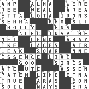 ACROSS 1. Electrical Unit 4. _ mater 8. Past tense of be (plural) 12. To sift 13. Welt 14. Length times width 15. Singer James 17. Globular water bottle used in Asia 18. Removes the wrinkles 19. Father Junipero _ 21. 17th letter of the Greek alphabet 23. Be seated 24. Turbulent 26. Followers of ems 28. Actor Baldwin 30. Heighten or intensify 34. Fish or hair follower 37. Grant temporary use of 39. Like ___ of sunshine 40. Eisenhower's nickname 41. Shoestrings 43. Wind 44. Path through which fluid escapes 46. Fly high 47. Compass dir. 48. Center 51. Moving, as bait 54. Thick or sticky substance 55. Titles for men of rank and authority 58. Had dinner 61. Shoshoni 63. NE Netherlands city 65. Eucharist need 67. Welles in "The Third Man" 71. Inactive volcano in Sicily 72. Loyal 73. Caspian sea tributary 74. Age 75. Earth 76. Negative votes 77. Epoch DOWN 1. Ancient Greek god of war 2. Distance measurement 3. Stone: prefix 4. Leather borer 5. Lion 6. Floor covering 7. Having or resembling wings 8. Armed conflict 9. Greek god of love 10. Painter Guido (1575-1642) 11. Compass direction 16. Operatic vocal solo 18. Charged atoms 20. 100% 22. Layer 25. Shout 27. Health resort 29. Desist 30. Standard of perfection 31. SW Asia republic 32. Precipitation 33. Jane of fiction 34. Mediterranean tributary 35. Supplements with great effort 36. Afternoon social gatherings 38. Non-commissioned officer (abbr.) 42. Indian titles of respect 45. Barrel 49. Part of speech 50. Small bed 52. By way of 53. Celtic language 56. First name in cosmetics 57. Sir (Sp.) 58. Tenement units (abbr.) 59. Pacific island yam 60. Needle holder 62. Flair 64. Grandmother 66. Snakelike fish 68. Lyricist Gershwin 69. Can I? 70. Double-curved letter