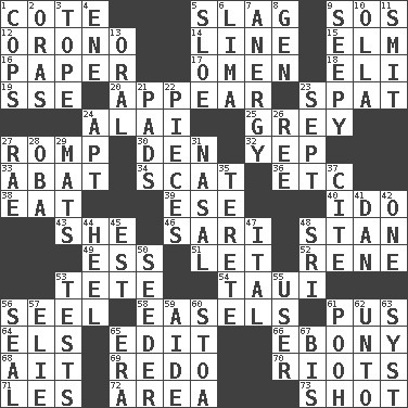 ACROSS 1. ____ d'Azur (French Riviera) 5. Volcanic refuse 9. Mayday 12. U. of Maine site 14. Actor's bit 15. Shade tree 16. Some stationery 17. Presage 18. Connecticut Ivy Leaguer 19. Compass dir. 20. Become visible 23. Argument over a trivial matter 24. Jai _ 25. Jennifer or Joel 27. Play 30. Lair 32. Slangy assent 33. Blind as ____ 34. Scram! 36. And so on (abbr.) 38. Ingest 39. Compass dir. 40. Wedding promise 43. A female animal or person 46. Indian skirt 48. Comedian Laurel of Laurel & Hardy 49. Double-curved letter 51. Allow 52. French philosopher Descartes 53. Wig 54. "Change" in Tahitian 56. Sew up the eyelids of hawks and falcons 58. Artist's stands 61. Festering 64. Raised railways 65. Prepare for publication 66. Dark wood 68. Small island 69. Make new 70. Debaucheries 71. French article 72. Type of rug 73. Guess DOWN 1. 911 reaches them 2. Mouths or openings 3. Drink excessively 4. Compass dir. 5. A type of plum 6. Pale green bean 7. Disorder of the immune system 8. Commissioned mil. rank 9. Not well drained, as in land 10. Water jar 11. Stricken, poetically 13. Spoken 21. Writing tablets 22. Components 23. Back-to-school mo. 24. Fitting 26. To riddle 27. Actress Charlotte 28. Chief or king in Benin or Nigeria 29. Floor protectors 31. Rhinal 35. Cylindrical with tapered ends 37. Quote 41. One of the 12 tribes of Israel 42. Single 44. The bottom of a shoe or boot 45. Eastern Standard Time (abbr.) 47. Slanted text style (abbr.) 48. _ Lanka 50. Sowing specialist 53. Trials 55. One who uses or employs something 56. Lick closed 57. Writer Wiesel 59. Assistant 60. Portico 61. "Silly old bear" 62. To (old English) 63. System (abbr.) 65. Epoch 67. Twice
