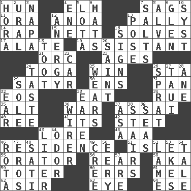 ACROSS 1. Attila the _ 4. Shade tree 7. Settles 11. Mouth or opening 12. Small Philippine buffalo 13. Chummy 14. Reproach for some lapse or misdeed 15. Remaining after all deductions 16. Finds the solution 17. Having winglike extensions 19. Aide 21. The grampus (Milton) 23. Eons 24. Ancient Roman robe 25. Victory 26. R.R. building 29. Man with strong sexual desires 30. Followers of ems 31. Baking dish 32. Greek goddess of the dawn 33. Ingest 34. Regret 35. Keyboard modifier key 36. Armed conflict 37. Slender Brazilian palm 40. To separate or throw off 41. It is 42. Proofreading order 43. Old wives' tales, e.g. 45. American Automobile Association (abbr.) 46. Home 51. Small island 55. Speaker 56. Rump 58. Alias (abbr.) 59. Carrier 60. Blunders 61. Cartoonist voice _ Blanc 62. SW Saudi Arabia district 63. Sight organ 64. Compass dir. DOWN 1. Israeli folk dance 2. Mountain range 3. California wine valley 4. Compass dir. 5. Globular water bottle used in Asia 6. Floor coverings 7. Table seasonings 8. Inventor's middle name 9. Small, secluded valley 10. System (abbr.) 12. Disorder of the immune system 13. Introduce or present, as a question 16. Attaches a signature 18. A blast of a horn 20. Inhabitant of Heaven 22. Automobile 24. Clothes sense 25. Erodes 26. Small fatty European fish 27. "Change" in Tahitian 28. One (Scot) 29. Not divided or shared with others 32. Ewer handle 33. Ingested 36. One who wires 37. White ___ sheet 38. Flight of steps 39. Oceans 43. 61 cubic inches 44. Aroma 46. Roll call or roster of names 47. Greek god of love 48. Suttee (variant) 49. Algonquian 50. Suggestive of the supernatural 52. Unable to walk 53. Makes supply last 54. Falsehood 57. "We ___ not amused" (Victoria)