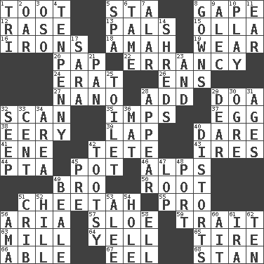 ACROSS 1. A blast of a horn 5. R.R. building 8. Stare wonderingly 12. To erase 13. Friends 15. Rounded earthenware pot or jar 16. Removes the wrinkles 18. Nursemaid 19. Erode 20. Infant food 22. Tendancy to err 24. Part of Q.E.F. 26. Followers of ems 27. Billionth: prefix 28. Find the sum of 29. ___ good deed 32. Glance over 35. Naughty children 37. Oval reproductive body of a fowl 38. Suggestive of the supernatural 39. Infant locale 40. Have the gumption 41. Compass dir. 42. False hair 43. Angers 44. Parent Teacher Association (abbr.) 45. Plant holder 46. High mountains 49. Sis' sibling 50. Carrot, for example 51. Leopard's kin 55. Adept person 56. Roberta Peters solo 57. _ gin 59. Distinguishing feature 63. Place where flour is made 64. Shout 65. Hoop that covers a wheel 66. Competent 67. Snakelike fish 68. Comedian Laurel of Laurel & Hardy DOWN 1. Three (prefix) 2. Boat paddle 3. Bear (Spanish) 4. 3-inch nail 5. Health resort 6. Not wild 7. Having or resembling wings 8. Brides' dresses 9. Actor Baldwin 10. Frolic 11. Ewer handle 14. Fragments 17. "Two Mules for Sister ____" 21. Baking dish 23. Added to 25. Bathroom 28. Become visible 29. Letter starter 30. Legendary monster 31. Ripens 32. Ooze 33. Penny 34. Length times width 36. Floor covering 40. What propaganda does 42. Tootsie (variant) 45. Before (prefix) 47. Chop off 48. Left side of a ship or aircraft 49. Memphis, Tenn. Street 51. Baby bed with high sides 52. Land elevation 53. Toward shelter 54. Hollow 56. Wet nurse (var.) 58. Pipe bend 60. Small island 61. Lyricist Gershwin 62. Nine, plus one