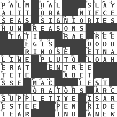ACROSS 1. Inside of hand 5. Actor Linden 8. Kill 12. Set down 13. Mouth or opening 14. Sibling's daughter 15. Oceans 16. Seigniories (variant) 19. Attila the _ 20. Thinks logically 21. Jacques of French films 23. Actress Charlotte 24. Portuguese money of account (variant) 27. Armor plate that protects the chest 30. Texas town _ City 31. Full of chinks, cracks, or crevices 34. Inactive volcano in Sicily 35. Actor's bit 38. Cartoon dog 40. Rich soil 41. Part of Q.E.F. 42. Main course 44. False hair 45. Collude with 46. Compass dir. 47. Big _ 50. For fear that 53. Speakers 57. Curve 59. Supplementary 63. Austrian river, tributary to the Danube 64. First name in cosmetics 65. Fenced enclosure 66. Travel on an animal 67. Separate forcefully 68. Indiana (abbr.) 69. Afresh DOWN 1. Romantic infatuation 2. Native American of Southwest Alaska 3. Climbing, woody, usually tropical vines 4. Mountains (abbr.) 5. Flexible conduit 6. Roberta Peters solo 7. Straggles 8. Title for a knight 9. Luau accessory 10. Adept person 11. Consenting reply 14. Olfactory organ 17. Not either 18. _ tizzy (2 wds.) 20. Swiss mountan, "Queen of the Mountains" 22. Cylindrical with tapered ends 24. Printing process, for short 25. Pulitzer Prize-winning author Ferber 26. Dutch treat 28. Mischievous child 29. Not divided or shared with others 30. Erase 32. Player for Phoenix 33. Singer James 35. Allows 36. Angers 37. Nathan's nickname 39. Globe 43. Snakelike fish 47. Undercover agent 48. "We ___ not amused" (Victoria) 49. Domesticated feline 51. Indian antelope 52. Swap 54. Native american tent (variation) 55. Baking chamber 56. Tear apart 58. Group working together 59. Put into a specified state 60. Purpose 61. Parent Teacher Association (abbr.) 62. For each 63. Lyricist Gershwin