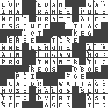 ACROSS 1. Trim (branches) 4. Dutch treat 8. Slender fish 11. _ tizzy (2 wds.) 12. Indian princess (variant) 14. Whine 15. Ancient Persian 17. A salt of uric acid 18. Toward shelter 19. Center 21. Pale purple color 23. Car dealer's back yard 24. Barrel 25. Celtic language 27. Hoop that covers a wheel 30. Madame (abbr.) 31. Poe poem 34. Call ___ day 37. The 18th letter of the Arabic alphabet 38. Utah city north of Ogden 39. Not either 40. Adept person 41. More lacking in sense or substance 43. Affectionate concern, for short 44. Vintage cars 45. Mitch Miller's instrument 47. Luau course 49. Enemy 50. Bodily heat indicating an inflammation 52. Electrical Measurement 56. Stockings 57. Saint headwear 60. Snaillike creature with no shell 61. "Tell ____ the Marines!" 62. Unconcealed 63. White ___ sheet 64. Observe 65. Grows older 66. It would DOWN 1. Welles in "The Third Man" 2. Singles 3. Groovy apts. 4. Spew [out] 5. Have the gumption 6. Santa ___, CA 7. Was introduced to 8. POW camp 9. Actor Baldwin 10. To riddle 13. Snakelike fish 14. Light colored 16. Snakelike fish 20. Christmas carol 22. Eisenhower's nickname 25. Independent ruler or chieftain 26. Former U.S. Attorney General Janet 27. Ancient Roman robes 28. SW Asia republic 29. French philosopher Descartes 30. Atlas unit 32. Writer Wiesel 33. Words to Nanette 34. To the inside or interior of 35. Lacquered or enameled metalware 36. Curve 42. Carrot, for example 44. River (Sp.) 46. Stakes 47. Thick mixture 48. Margarine 49. Goes without food and/or water 50. ____ d'Azur (French Riviera) 51. 17th letter of the Greek alphabet 52. Had on 53. Jai ____ 54. Abrupt rush of wind 55. Mild oath 56. Part of HMS, perhaps 58. Actress Gardner 59. Part of a journey