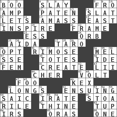 ACROSS 1. Sometimes accompanies a hiss 4. Kill 8. Away 11. Electrical Unit 12. Eucharist need 14. Narrow board 15. Allows 17. Collect or gather 18. Compass direction 19. Motivate 21. Movie unit 23. Double-curved letter 24. Globe 25. Opera by Verdi 27. Pacific island yam 30. Elect 31. Full of chinks, cracks, or crevices 34. Cartoonist voice _ Blanc 37. Compass dir. 38. Hauls 39. Binary compound 40. Opposite of masc. 41. Cause to be 43. Cards in a Roman deck? 44. "Mermaids" star 45. Electrical Unit 47. Egg _ yung 49. Dry husk or covering 50. Yearns 52. Following as a consequence or result 56. Ketch in the Levant 57. Feeling or showing extreme anger 60. Portico 61. Cause heat under the collar 62. One or ones belonging to thee 63. Uncastrated adult male sheep 64. Big collection agency 65. Mouths or openings 66. Single DOWN 1. Indonesian resort city 2. Sign of things to come 3. Elects 4. Practice fights 5. Unable to walk 6. "One Day ___ Time" 7. It is so 8. Flambe (short form) 9. To erase 10. Baseball player Mel 13. Science/research agcy. 14. Wither 16. Hurried 20. Austrian river, tributary to the Danube 22. Friend of Pooh 25. Domed church section 26. A whole individual unit 27. Carrier 28. Toward the sea 29. Respite 30. Order of Saint Francis (abbr.) 32. Hankering 33. Greater amount 34. Place where flour is made 35. Prepare for publication 36. Flowery wreath 42. Nights before holidays 44. Gear tooth 46. Amu Darya 47. Fencing necessities 48. Single time 49. Leg joints 50. Den 51. Be seated 52. Inactive volcano in Sicily 53. "Tell ____ the Marines!" 54. Part of speech 55. Yawn 56. _ Lanka 58. 17th letter of the Greek alphabet 59. Atmosphere