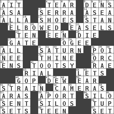 ACROSS 1. Small island 4. Separate forcefully 8. Hiding places for outlaws 12. White ___ sheet 13. Spanish missionary in California 14. Toward the sea 15. Silent film actress Nazimova 17. Imelda's hoard 18. Comedian Laurel of Laurel & Hardy 19. Turned at an angle; bent 21. Artist's stands 23. "___ Little Indians" 24. Car or cant ending 26. Expire 27. Yard entry 28. Double curve, resembling the letter S 30. 100% 31. Titan orbits this 34. Luau course 37. Born 38. One or ones belonging to thee 39. The grampus (Milton) 40. Followers of ems 41. A girl or young woman (variant) 42. Actress Charlotte 43. Monetary unit of Yemen 44. Allows 46. Grand Old Party 47. Morning condensation 50. Hearing organ 51. Put through a sieve 54. Devices for capturing images 57. Ancient river in northeast Turkey 58. To the left, to Queeg 60. Grain storage tower 62. Transmitted 63. Grain storage towers 64. Uncastrated adult male sheep 65. Arranges properly for use 66. Adolescent 67. Arrange properly for use DOWN 1. Auto club (abbr.) 2. Small island 3. Baron Munchausen's specialties 4. Giggle 5. Wear away 6. "We ___ not amused" (Victoria) 7. To erase 8. Hyrax 9. First name in cosmetics 10. Be tempered by heat 11. Without 13. Compass dir. 16. Collude with 20. Single 22. Arabian gulf 25. Parts of speech 27. Small, secluded valley 29. Jennifer or Joel 30. One (Scot) 31. Portico 32. Hold, grip (Informal) 33. Teat (slang) 34. Likenesses of persons 35. Mouths or openings 36. Frozen water 41. Native american tent (variation) 43. Ridicules or criticizes harshly 44. Area sheltered from the wind 45. Hearing organs 46. Monetary aid 48. Learning spot: Fr. 49. Make _____ (do battle with) 51. Backtalk 52. Family _ (genealogy) 53. Political cartoonist Thomas 55. Mountains (abbr.) 56. Change direction abruptly 59. Sliced dessert 61. Elect
