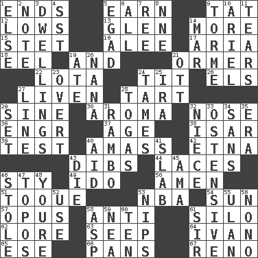 ACROSS 1. Extremities 5. Merit 9. Make lace 12. Moos 13. Small, secluded valley 14. Greater amount 15. Proofreading order 16. Toward shelter 17. Roberta Peters solo 18. Snakelike fish 19. Added to 21. Channel Islands abalone 22. Globular water bottle used in Asia 24. Teat (slang) 26. Raised railways 27. Make or become more lively 28. Small pie 29. Trig term 30. Odor 32. Sense of smell 36. Engineer (abbr.) 37. Ripen 38. Austrian river, tributary to the Danube 39. Trial 40. Collect or gather 42. Inactive volcano in Sicily 43. Claim 44. Shoestrings 46. Filthy place 49. Wedding promise 50. So be it 51. Woman's close-fitting hat 53. Basketball assoc. 54. Player for Phoenix 57. Musical composition 58. Against 61. Grain storage tower 62. Old wives' tales, e.g. 63. Ooze 64. _ the terrible 65. Compass dir. 66. Zero-star reviews 67. Western Nevada city DOWN 1. Otherwise 2. Short letter 3. Residences 4. Fast jet (abbr.) 5. Mild oath 6. Everything 7. To riddle 8. Compass dir. 9. Singer Mel 10. Satellite of Uranus 11. Rends 14. Make imperfect 19. Had dinner 20. Grandmother 21. Baseball player Mel 23. Unconcealed 24. Domesticates 25. Retirement account (abbr.) 27. Actor's bit 28. Ancient Roman robes 29. Put into a specified state 31. Role for Stallone 32. Sibling's daughter 33. Clearly or manifestly demonstrative 34. Without 35. Epoch 40. Help 41. Broad, flat, thick piece 43. Expire 45. Housemaid (var.) 46. Fur scarf 47. Literary convention 48. You are 52. Purpose 53. Pinches, bites 55. ____ Bator 56. Words to Nanette 58. Cleo's killer 59. Teachers' org. 60. "___ Little Indians" 61. Title for a knight