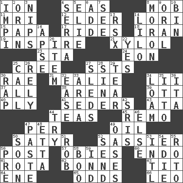 ACROSS 1. Electrically charged atom 4. Oceans 8. Disorderly crowd 11. Medical imaging device (abbr.) 12. A person who is older than you are 14. Australian parrot (variant) 15. Dad 17. Amusement-park features 18. SW Asia republic 19. Stimulate to action 21. Xylene (variant) 23. R.R. building 24. Period of immesurable duration 25. Algonquian 27. Fast planes 30. Actress Charlotte 31. Ear of corn 34. Cards in a Roman deck? 37. Everything 38. Sports stadium 39. Baseball player Mel 40. Strand of rope, yarn or thread 41. Spring feasts 43. "One Day ___ Time" 44. Afternoon social gatherings 45. San ____ (Riviera town) 47. For each 49. Lubricate 50. Letch 52. More disrespectful 56. Mail 57. Off-Broadway awards 60. Inside; within (prefix) 61. Round or rotation of duties 62. Maid-servant 63. Teat (slang) 64. Compass dir. 65. Probability 66. Lion DOWN 1. Body of Kaffir warriors 2. Northwest Algerian city 3. Cuts off 4. Father Junipero _ 5. Writer Wiesel 6. Find the sum of 7. Observe 8. Person of subnormal intelligence 9. Taken by mouth 10. Storage container 13. Acura sports coupe 14. _ and Stitch 16. Domed church section 20. A whole individual unit 22. Consenting reply 25. Give a ring to 26. Depend 27. Bobsleighs 28. Trig term 29. Separate forcefully 30. Hit sharply and swiftly 32. Comfort 33. Type of rug 34. Rich soil 35. "Tell ____ the Marines!" 36. Call ___ day 42. Indian titles of respect 44. Attempt 46. Otherwise 47. Thick mixture 48. Singer James 49. Fertile tracts in a desert 50. Within a short period 51. Director Reiner 52. Post 53. International (abbr.) 54. Singer Brickell 55. Printing process, for short 56. Before (prefix) 58. Sometimes accompanies a hiss 59. Working for oneself (abbr.)